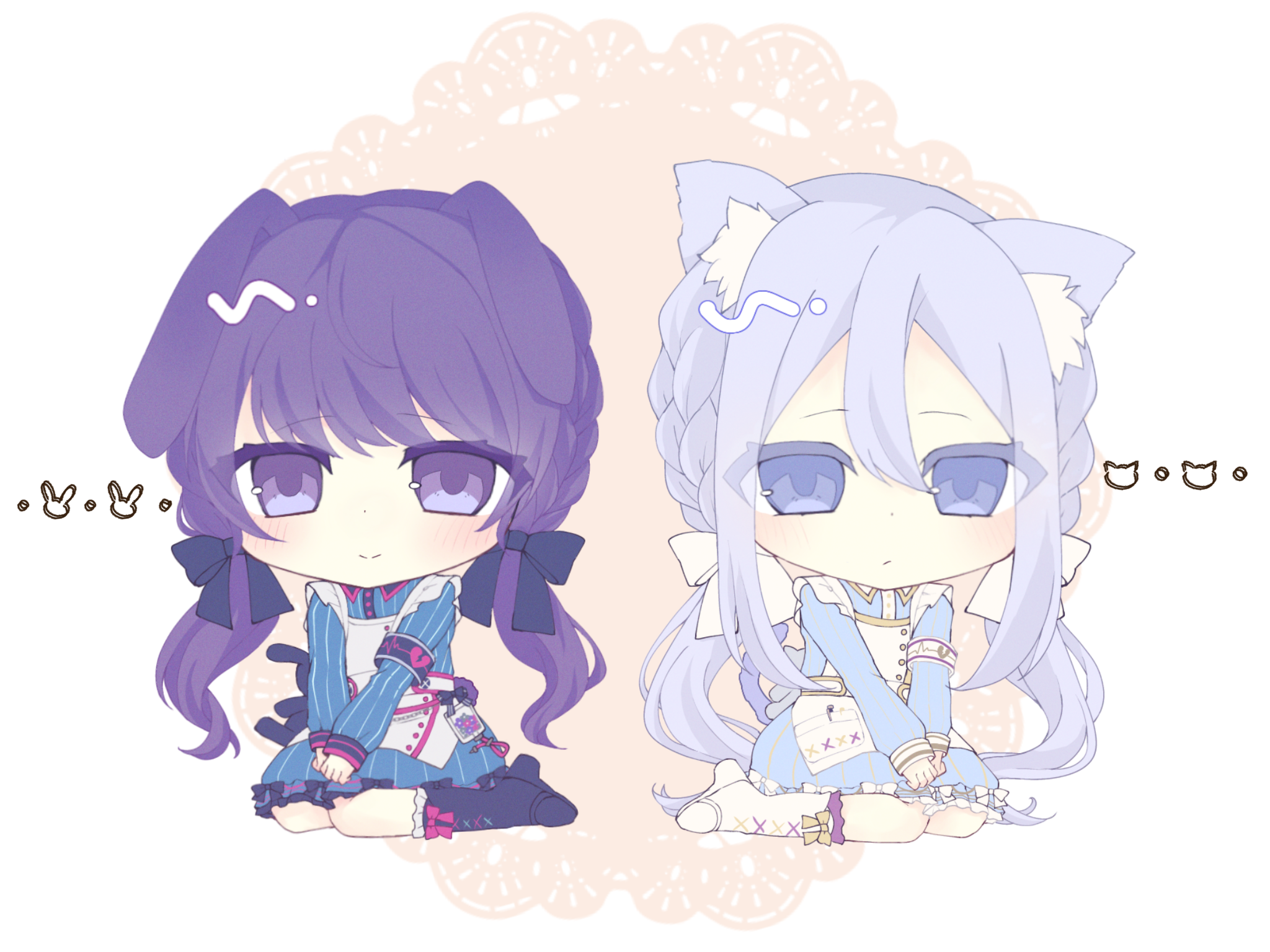 2girls alternate_color alternate_costume alternate_hairstyle animal_ear_fluff animal_ears apron armband asahina_mafuyu blue_dress blush boots bow cat_ears cat_tail chibi collared_dress dress dress_bow frilled_apron frilled_dress frilled_footwear frills hair_bow highres lace-up_boots long_hair low_twintails multiple_girls nurse official_alternate_costume official_alternate_hairstyle on_floor own_hands_together project_sekai purple_armband purple_eyes rabbit_ears sitting striped_clothes striped_dress stuffed_animal stuffed_rabbit stuffed_toy suzu_mimi0815 swept_bangs tail twintails vertical-striped_clothes vertical-striped_dress very_long_hair white_apron white_armband wonderhorror~!?_na_kimodameshi!_(project_sekai) yoisaki_kanade