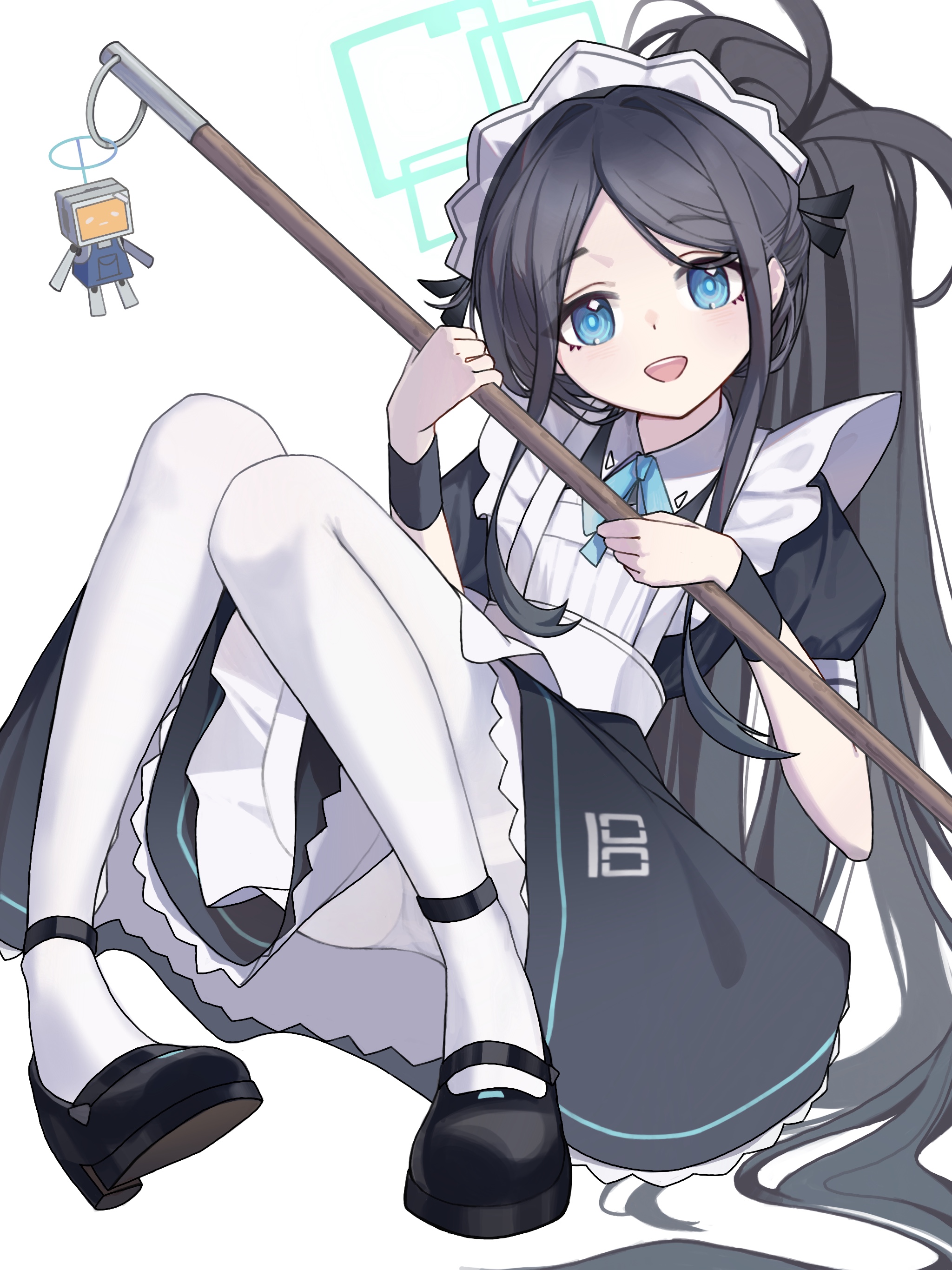 1girl absurdres aqua_halo aris_(blue_archive) black_hair blue_archive blue_eyes commentary eriri2000420 halo highres holding holding_mop long_hair maid maid_headdress mop pantyhose puffy_short_sleeves puffy_sleeves rectangular_halo short_sleeves solo very_long_hair white_pantyhose