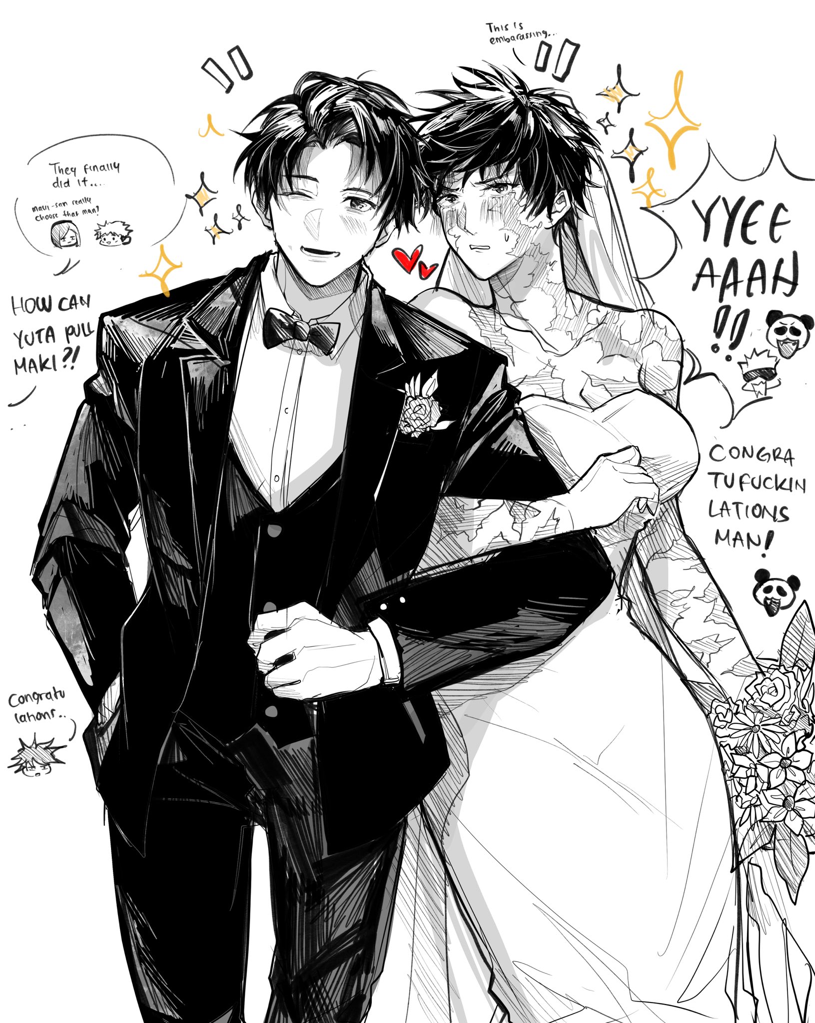 2girls 5boys alternate_costume animal blush bouquet bow bowtie bridal_veil character_request check_character chibi commentary couple dress english_commentary english_text flower formal_clothes fushiguro_megumi gojo_satoru greyscale heart hetero highres holding holding_bouquet itadori_yuji jujutsu_kaisen kugisaki_nobara locked_arms long_sleeves monochrome multiple_boys multiple_girls muscular muscular_female okkotsu_yuta one_eye_closed panda panda_(jujutsu_kaisen) pants partially_colored qeanoya scar scar_on_face smile speech_bubble suit veil wedding wedding_dress zen'in_maki zen'in_maki_(post_shibuya)