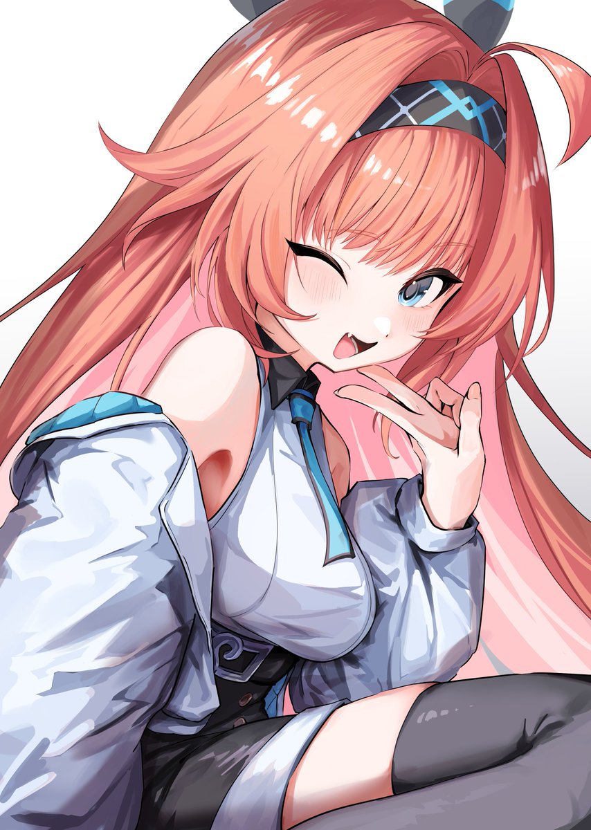 1girl ahoge bare_shoulders black_hairband black_thighhighs blue_eyes blue_necktie blush breasts character_request fang hairband highres jacket long_hair long_sleeves looking_at_viewer medium_breasts necktie neneneneko off_shoulder one_eye_closed open_mouth orange_hair red_hair shadowverse shadowverse:_worlds_beyond shirt simple_background sleeveless sleeveless_shirt smile solo thighhighs underbust v virtual_youtuber white_background white_jacket white_shirt