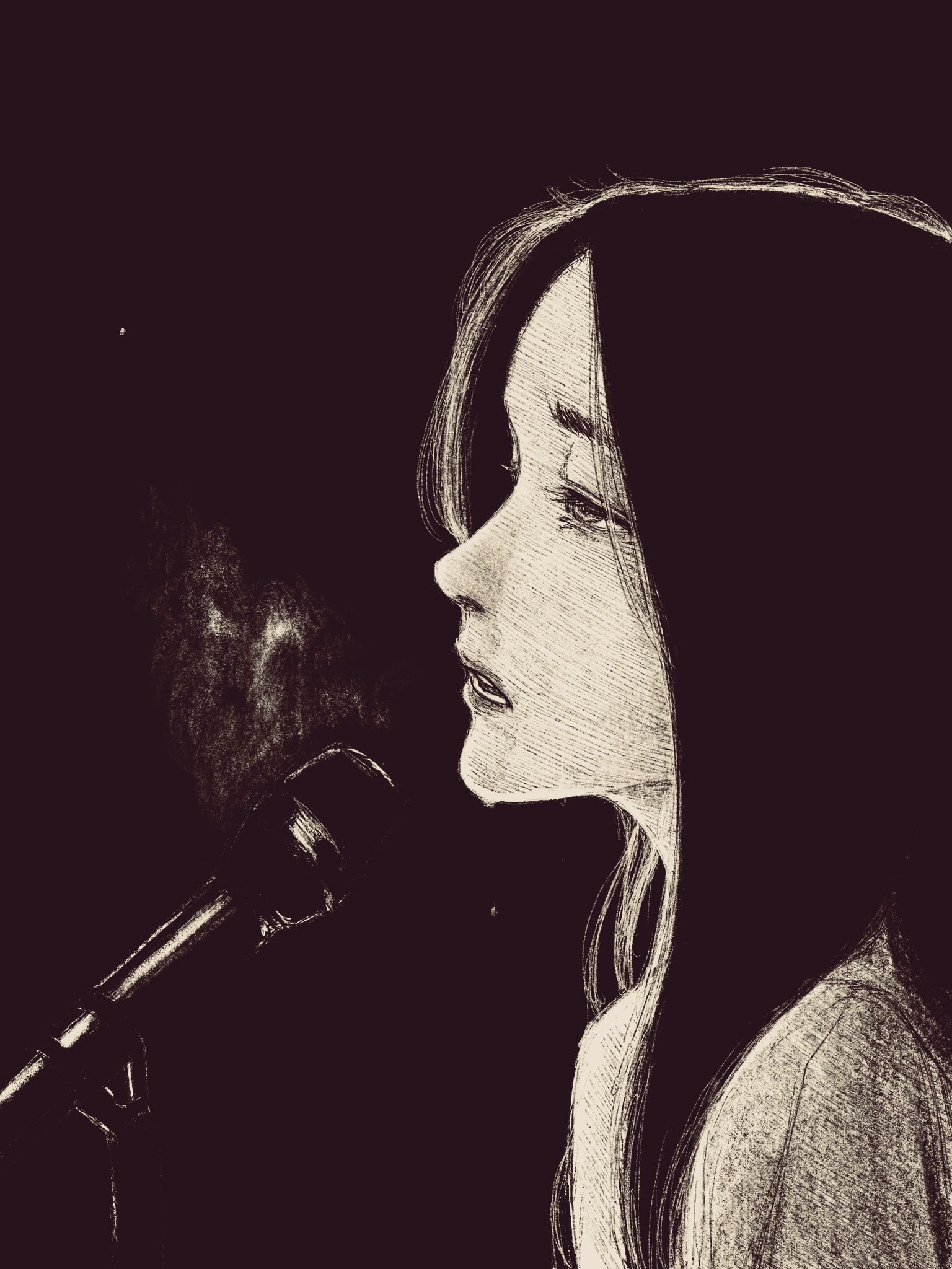 1girl black_background black_hair greyscale highres long_hair looking_to_the_side microphone microphone_stand monochrome original solo tp_p_pt