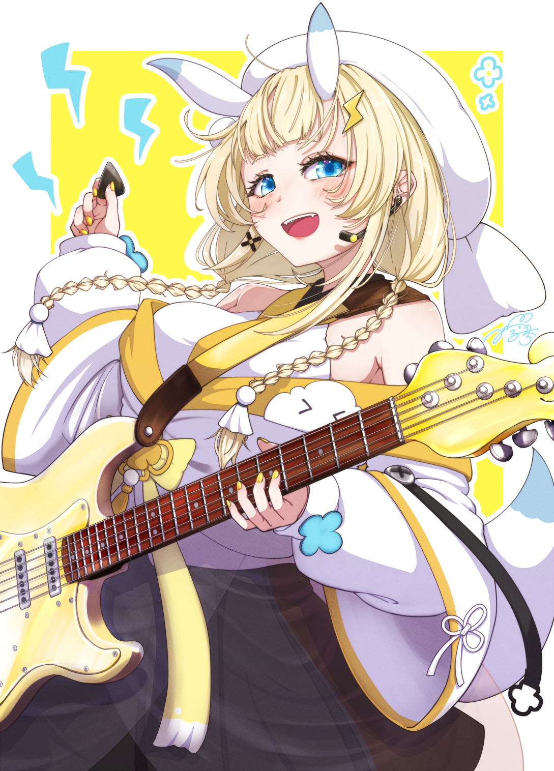 1girl :d bare_shoulders black_skirt blonde_hair blue_eyes blue_horns blue_tail blush border braid breasts coat coat_partially_removed cowboy_shot fangs flower_knot guitar hair_ornament hair_over_shoulder hakama hakama_skirt hat headset highres holding holding_guitar holding_instrument holding_plectrum horns instrument japanese_clothes kadou_mikaru kimono large_breasts layered_sleeves lightning_bolt lightning_bolt_hair_ornament lightning_bolt_symbol long_sleeves looking_at_viewer low_twin_braids miniskirt multicolored_horns nail_polish nijisanji open_mouth outline plectrum pom_pom_(clothes) pom_pom_hair_ornament puffy_long_sleeves puffy_sleeves ribbon screw see-through_clothes short_over_long_sleeves short_sleeves sidelocks signature simple_background skirt smile solo teruterubouzu twin_braids two-tone_horns two-tone_tail usui_ryuusan virtual_youtuber white_border white_coat white_hat white_horns white_kimono white_outline white_tail x_hair_ornament yellow_background yellow_nails yellow_ribbon yellow_trim