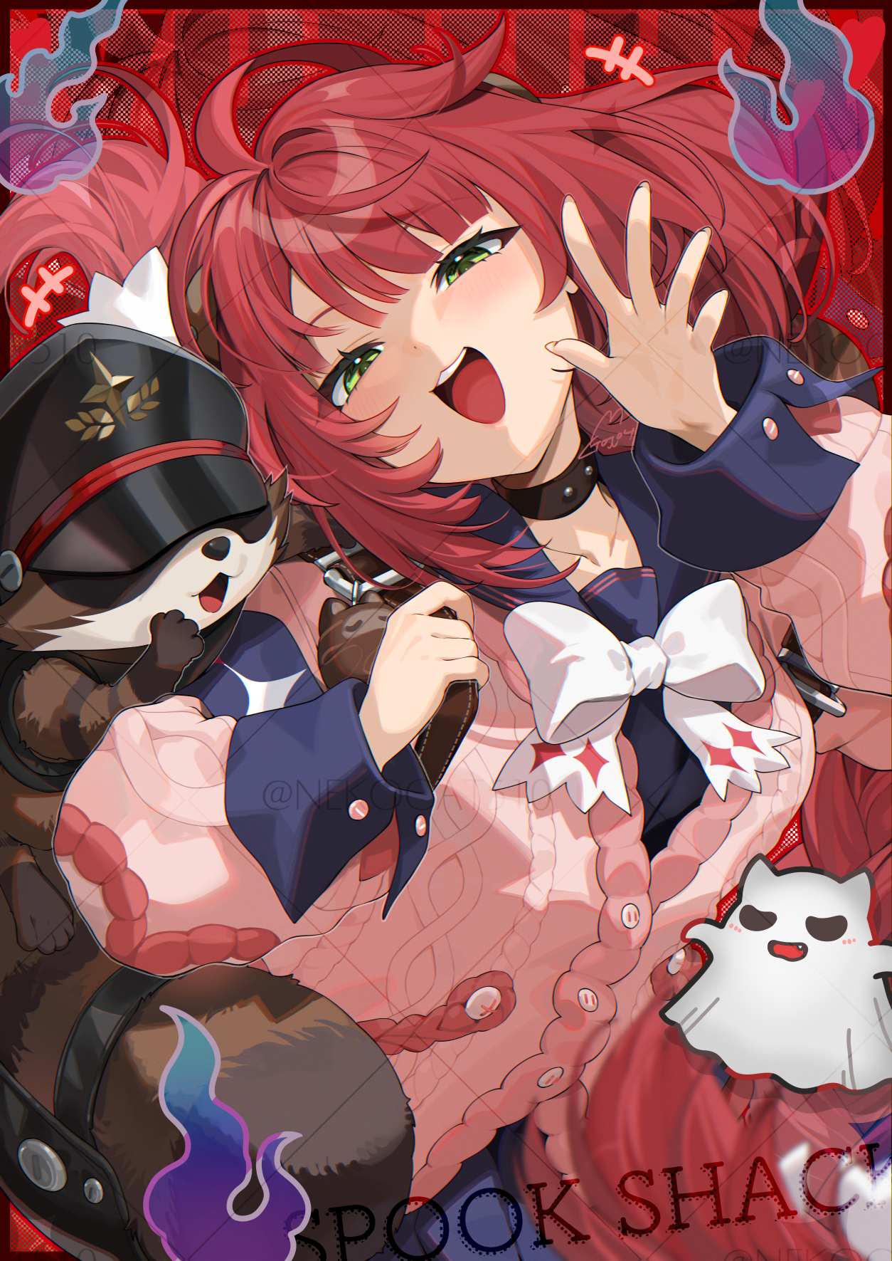 1girl 1other backpack bag cardigan charm_(object) chest_bow ghost gotoh_(nekocat) green_eyes hair_ornament hat hearing_aid highres kamanosuke_(zenless_zone_zero) looking_at_viewer open_mouth pink_cardigan raccoon red_background red_hair sphere_hair_ornament tanuki teeth ukinami_yuzuha upper_teeth_only waving zenless_zone_zero