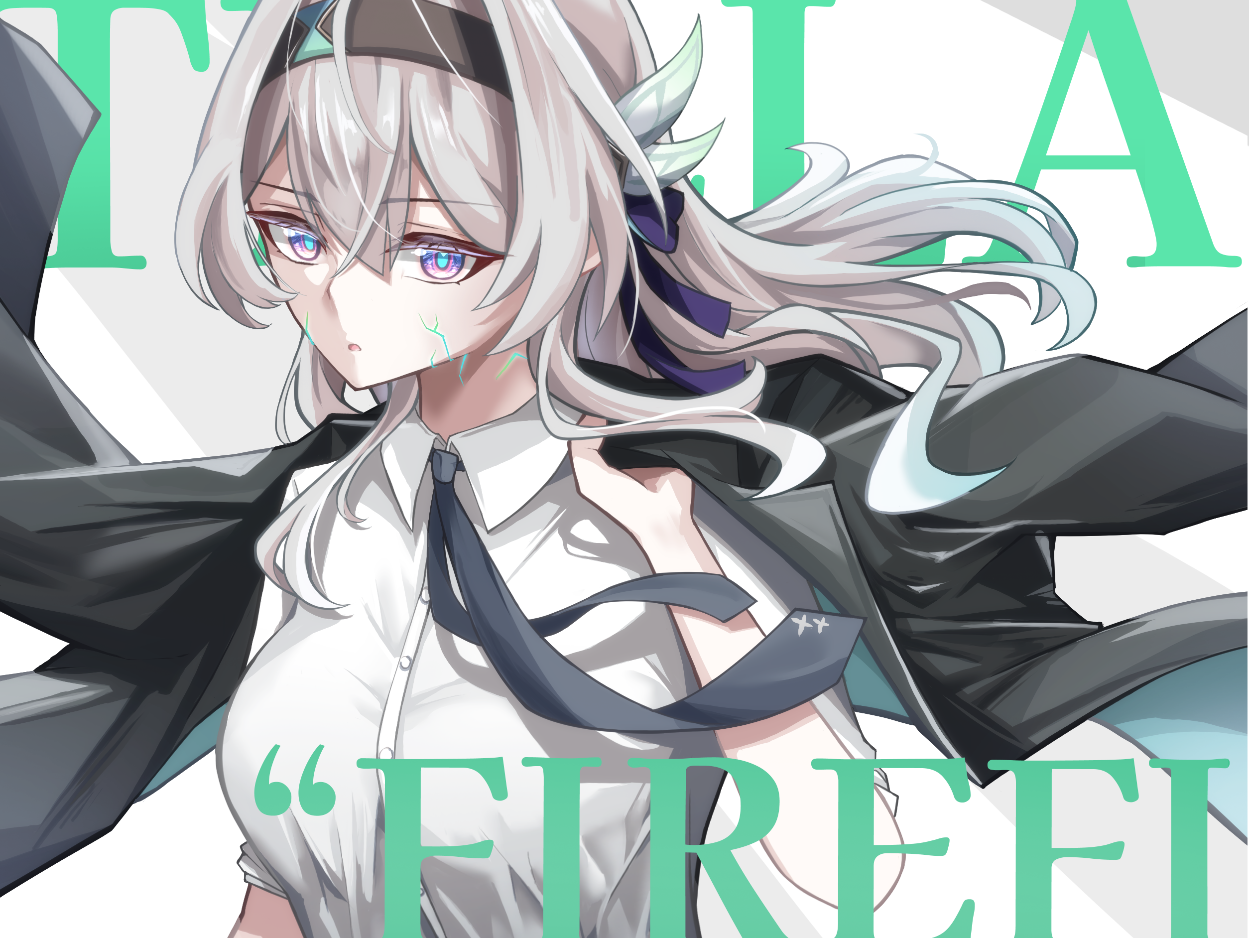 1girl alternate_costume black_hairband black_jacket black_necktie buttons character_name collared_shirt firefly_(honkai:_star_rail) gradient_hair green_hair grey_hair hair_between_eyes hair_intakes hair_ornament hairband hibachaaa highres holding holding_jacket holding_unworn_clothes holding_unworn_jacket honkai:_star_rail honkai_(series) jacket long_hair long_sleeves looking_at_viewer multicolored_hair necktie open_mouth pink_eyes shirt solo unworn_jacket upper_body white_shirt