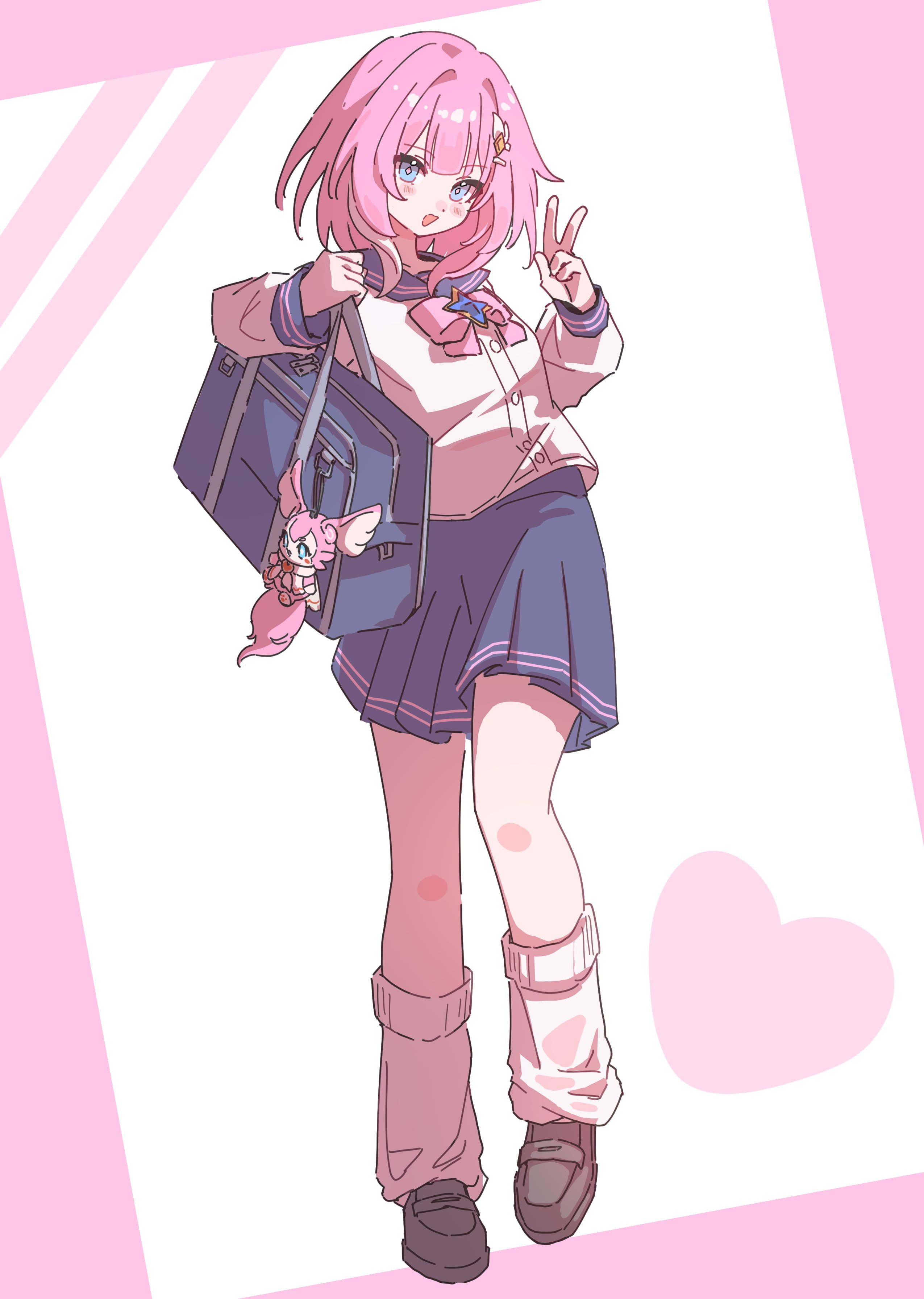 1girl absurdres bag blue_eyes blue_skirt breasts brown_shoes character_charm charm_(object) cyrene_(philia093)_(honkai:_star_rail) cyrene_(honkai:_star_rail) dress hair_ornament hashtag highres honkai:_star_rail honkai_(series) leggings multicolored_hair neneneneko official_alternate_costume open_mouth pink_hair pleated_dress school_uniform serafuku shoes short_hair shoulder_bag skirt small_breasts solo two-tone_hair v white_hair white_leggings white_serafuku