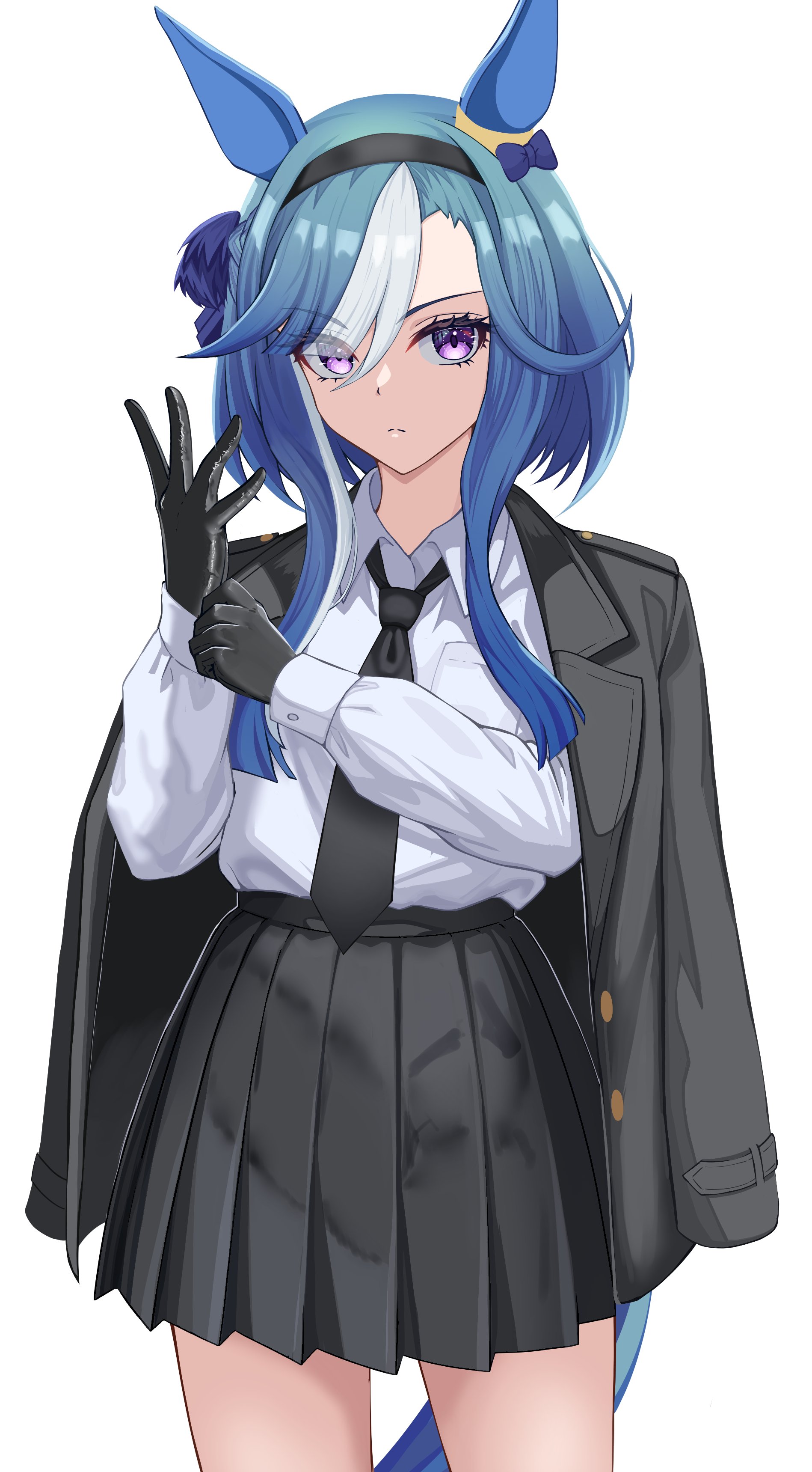 1girl absurdres admire_groove_(umamusume) alternate_costume animal_ears black_gloves black_hairband black_jacket black_necktie black_skirt blue_hair bow collared_shirt cowboy_shot ear_bow ear_covers gloves hairband highres horse_ears horse_girl jacket jacket_on_shoulders long_sleeves looking_at_viewer moyashi_toufu multicolored_hair necktie no_heterochromia no_mole pleated_skirt purple_eyes shirt shirt_tucked_in short_hair_with_long_locks sidelocks simple_background skirt solo two-tone_hair umamusume white_background white_hair white_shirt