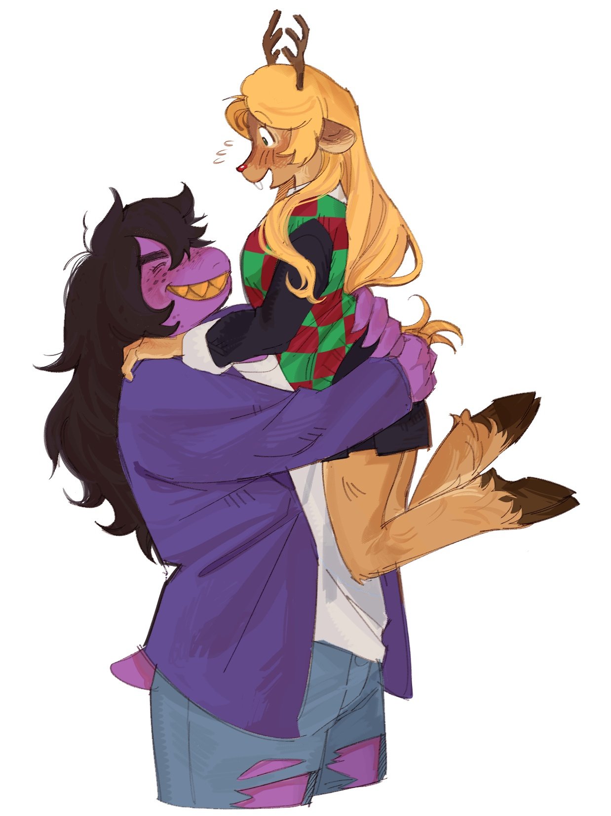 2girls antlers blonde_hair blush butch/femme_couple checkered_clothes colored_teeth deer_girl deltarune freckles furry furry_female grin height_difference highres hooves horns hug jacket lifting_person long_hair multiple_girls noelle_holiday pants purple_jacket reindeer_antlers reptile_girl skirt smile susie_(deltarune) susujenii torn_clothes torn_pants utdr_(toby_fox) white_hair yellow_teeth yuri