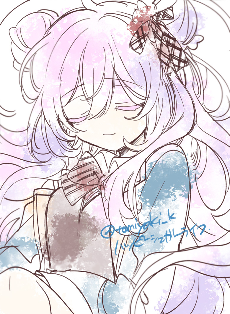 1girl bow closed_eyes copyright_name double_bun hair_bun hair_ribbon happy_sugar_life kagisora_tomiyaki long_hair matsuzaka_satou pink_hair ribbon school_uniform solo twitter_username