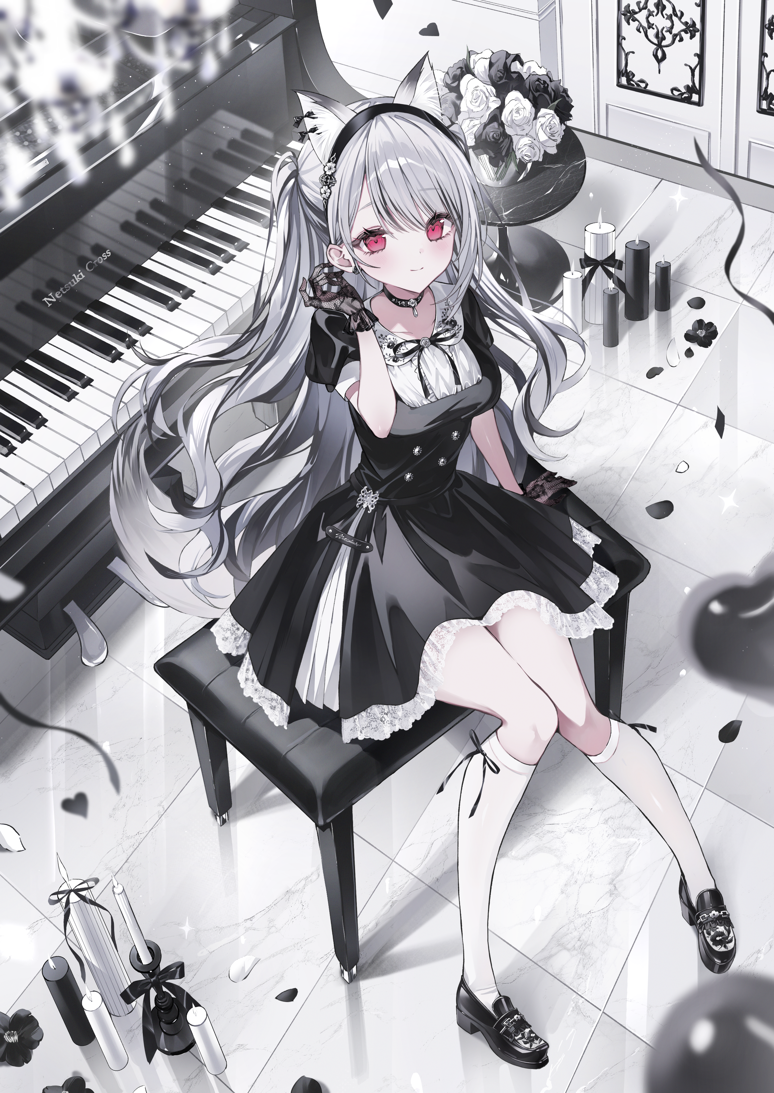 1girl absurdres animal_ears black_choker black_dress black_flower black_gloves black_hairband black_ribbon black_rose black_shoes candle chandelier choker closed_mouth dress flower fox_ears fox_girl fox_tail full_body gloves grey_hair hairband highres indie_virtual_youtuber instrument juliet_sleeves kneehighs lace lace_gloves long_hair long_sleeves looking_at_viewer netsuki_cross noah_(0noah) petals piano piano_bench puffy_short_sleeves puffy_sleeves red_eyes ribbon rose shoes short_sleeves sitting smile socks solo tail virtual_youtuber white_flower white_rose white_socks white_theme