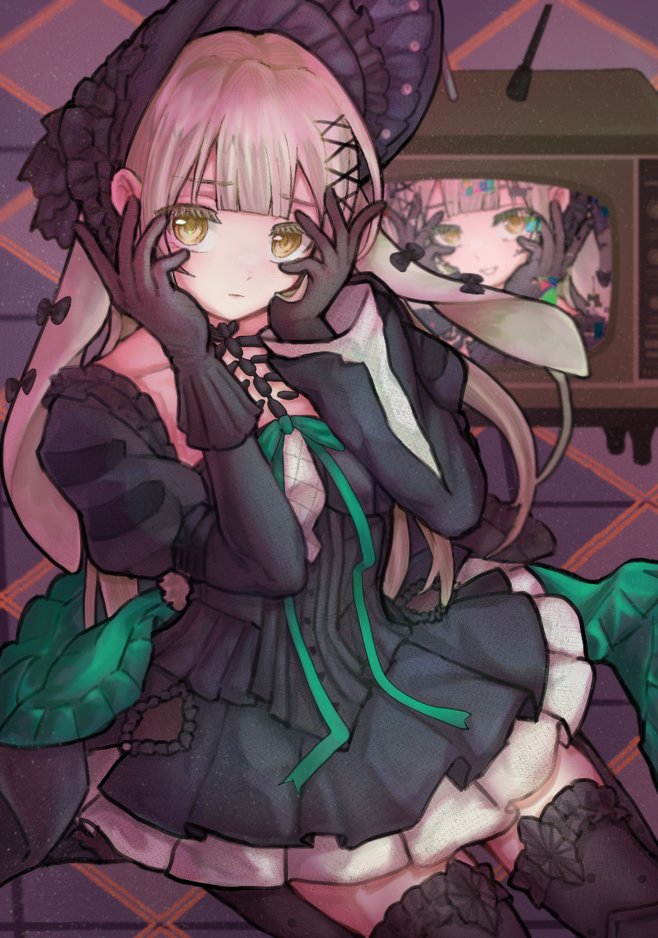 1girl animal_ears arknights bang_dream! bang_dream!_it's_mygo!!!!! black_bonnet black_dress black_gloves black_thighhighs blunt_bangs bonnet chinese_commentary closed_mouth commentary_request dress expressionless floppy_ears gloves gothic_lolita green_hair green_ribbon hair_ornament hands_on_own_cheeks hands_on_own_face hands_up highres lolita_fashion long_hair long_sleeves looking_at_viewer mortis_(bang_dream!) mortis_(persona)_(bang_dream!) nanaura_komi rabbit_ears rabbit_girl ribbon sidelocks sitting solo television thighhighs wakaba_mutsumi wakaba_mutsumi_(marionette's_id) wariza x_hair_ornament yellow_eyes