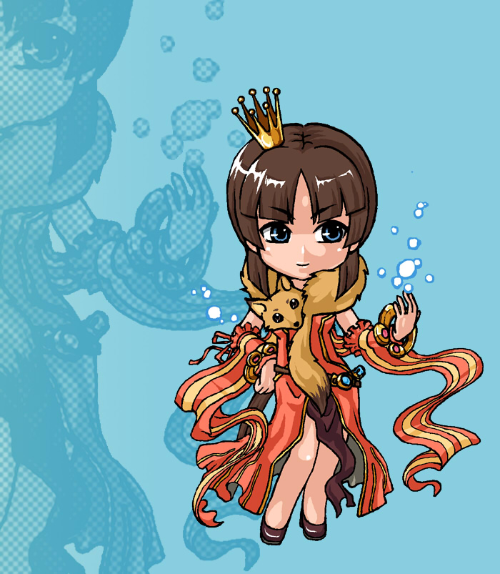 1girl animal animal_around_neck bangle blue_background blue_eyes blunt_bangs bracelet brown_hair brown_shoes chibi chibi_only closed_mouth commentary_request contrapposto crown detached_sleeves dress fox full_body jewelry long_hair looking_afar mini_crown pelvic_curtain professor_(ragnarok_online) ragnarok_online red_dress red_sleeves shoes sleeveless sleeveless_dress smile solo standing striped_sleeves susukinohukurou yellow_sleeves zoom_layer