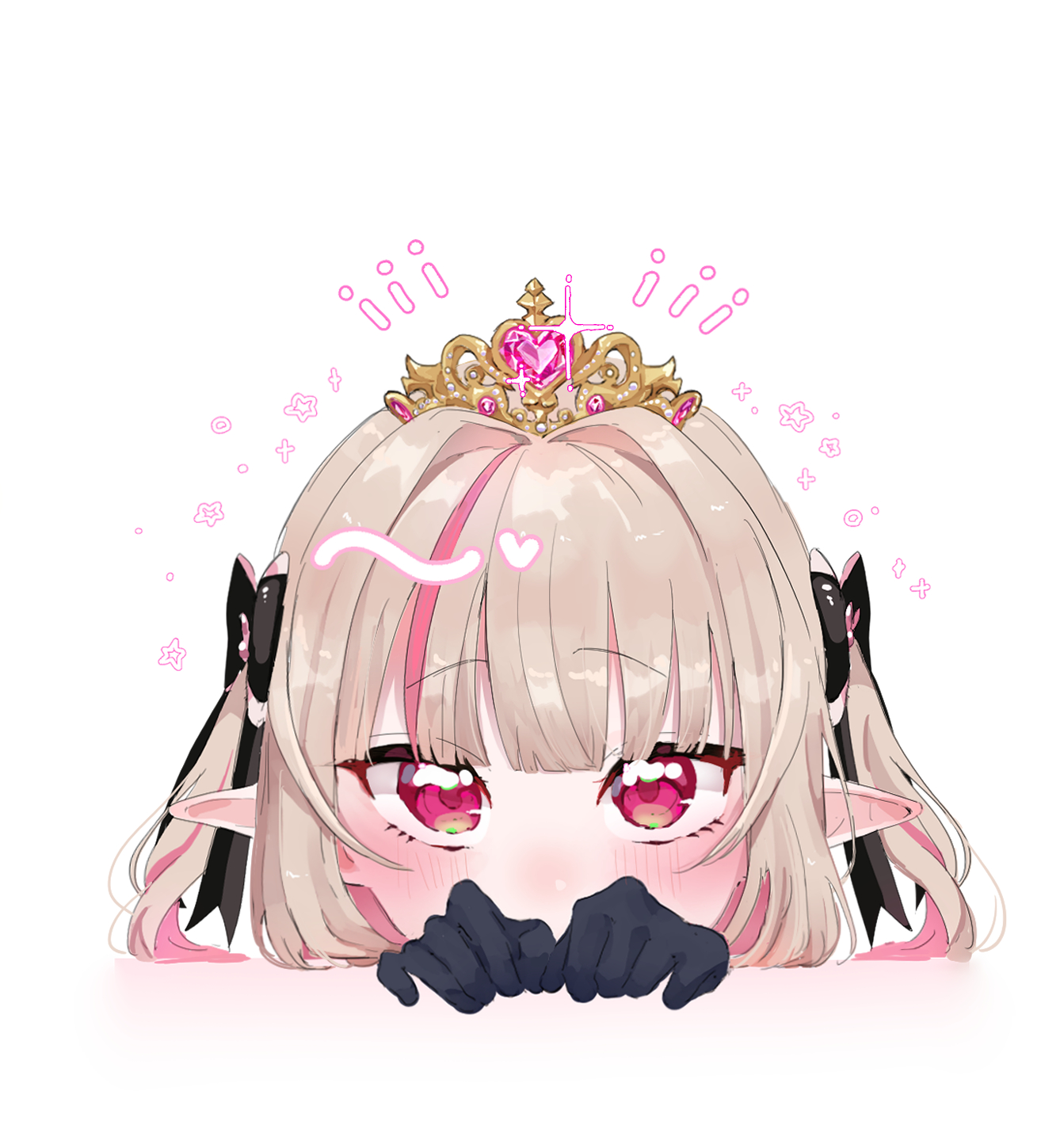 1girl black_gloves black_ribbon blunt_bangs blush colored_inner_hair covered_mouth emi537469 frilled_ribbon frills gloves grey_hair hair_intakes hair_ribbon heart highres idol_clothes looking_at_viewer makaino_ririmu multicolored_hair nijisanji nijisanji_idol_uniform official_alternate_costume peeking_out pink_hair pointy_ears red_eyes ribbon sidelocks simple_background solo straight-on streaked_hair tiara two_side_up upturned_eyes virtual_youtuber white_background