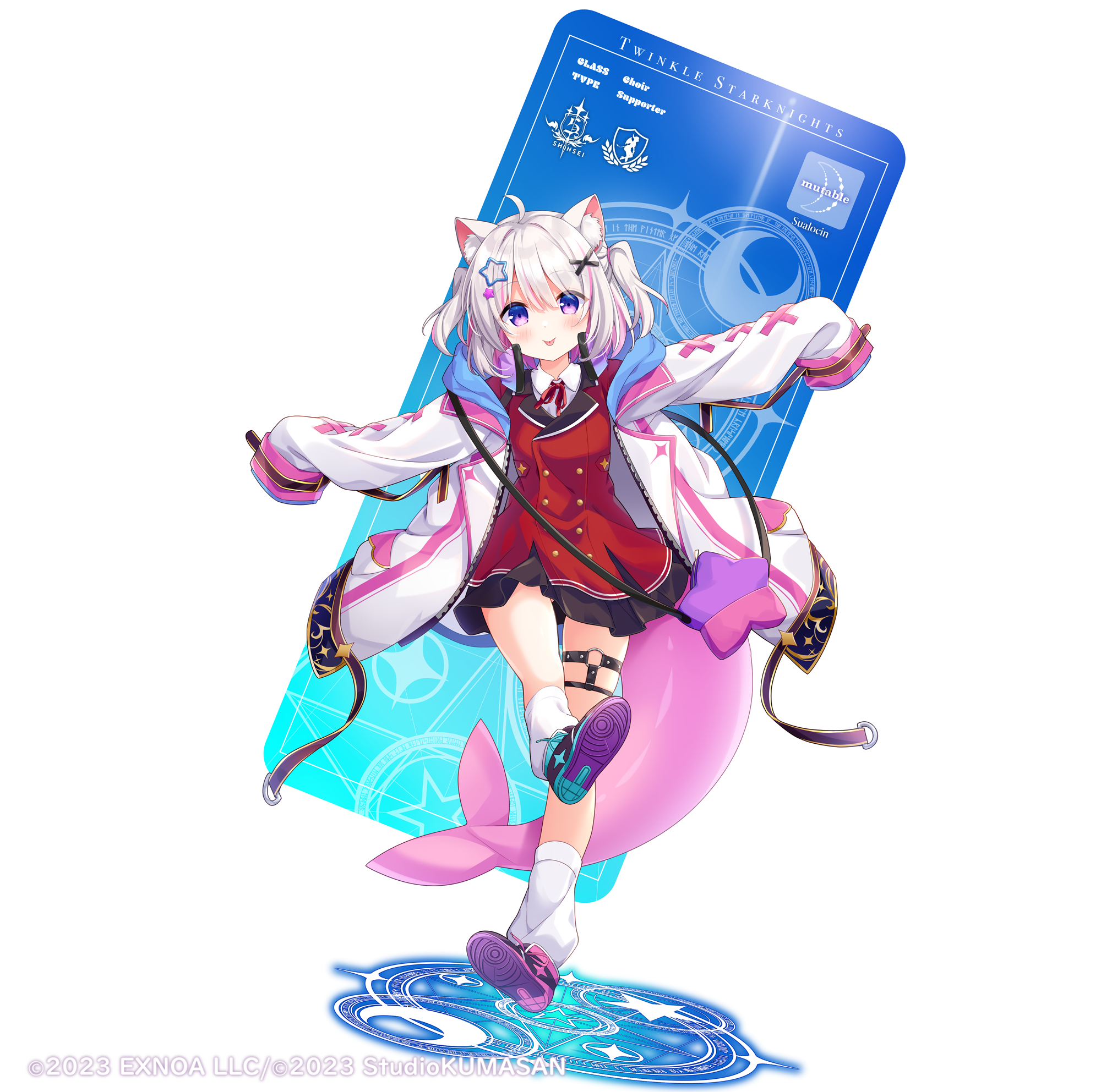 1girl ahoge animal_ear_fluff animal_ears black_skirt character_request collared_shirt copyright_notice fins fish_tail full_body hair_ornament highres jacket long_sleeves loose_socks multicolored_hair official_art open_clothes open_jacket pleated_skirt purple_eyes red_jacket shirt shoe_soles shoes skirt sleeves_past_fingers sleeves_past_wrists socks solo tail tongue tongue_out twinkle_star_knights umeko_machi virtual_youtuber white_jacket x_hair_ornament