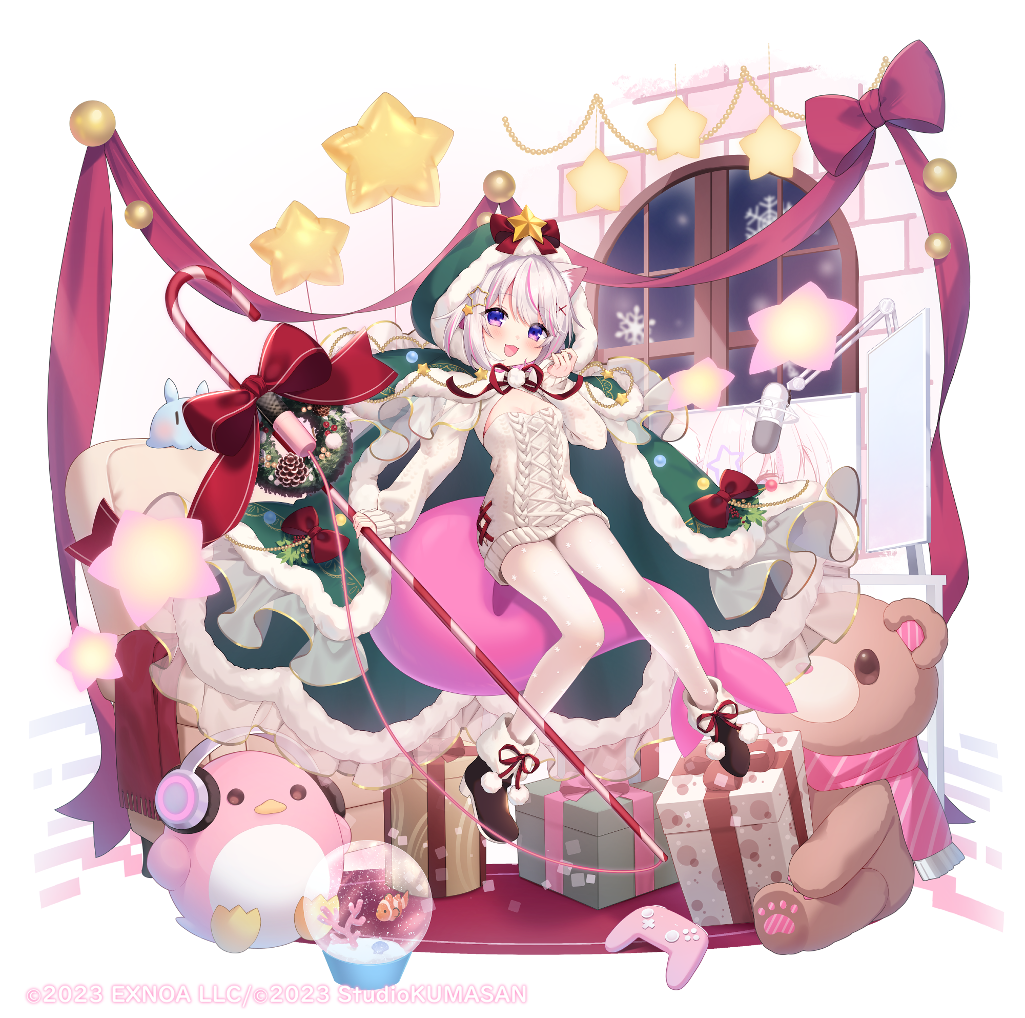 1girl :d bow box candy candy_cane cape character_request christmas christmas_ornaments cloak food fur-trimmed_cloak fur_trim gift gift_box green_cape hair_ornament headphones highres holding hood long_sleeves microphone multicolored_hair open_mouth pantyhose puffy_long_sleeves puffy_sleeves purple_eyes red_bow smile solo star_(symbol) star_hair_ornament streaked_hair stuffed_animal stuffed_toy sweater teddy_bear twinkle_star_knights umeko_machi white_pantyhose window