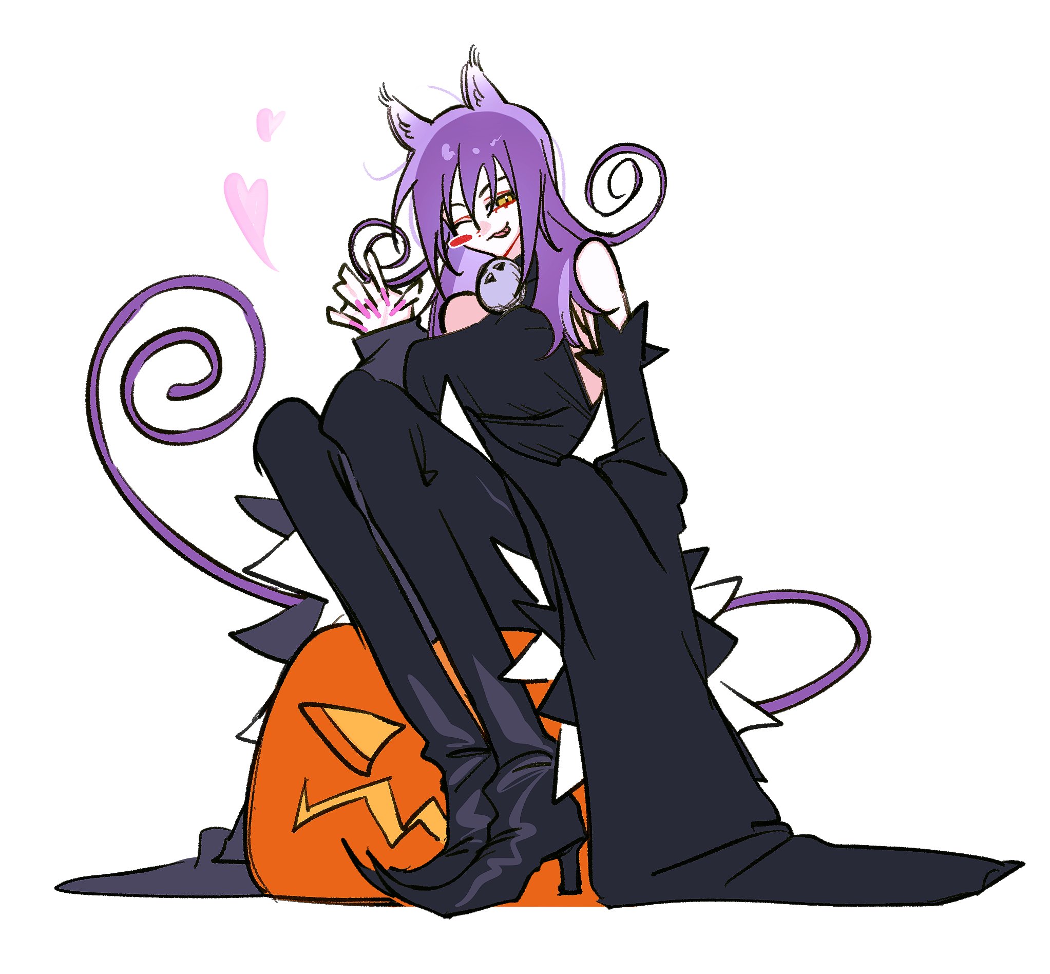 1girl animal_ears blair_(soul_eater) boots brooch cat_ears cat_girl cat_tail dress highres jewelry looking_at_viewer medium_hair pumpkin purple_dress purple_hair se_4242564 solo soul_eater tail thigh_boots thighhighs tight_clothes tight_dress witch yellow_eyes zettai_ryouiki