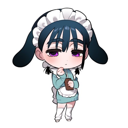 1girl 2a1i7a15pb11392 alien_stage animal_ears apron black_hair blue_dress bow chibi chibi_only commentary dress hair_bow leg_warmers long_sleeves lowres maid_headdress multiple_hair_bows purple_eyes rabbit_ears short_twintails solo sua_(alien_stage) untranslatable_commentary twintails white_apron white_bow white_leg_warmers