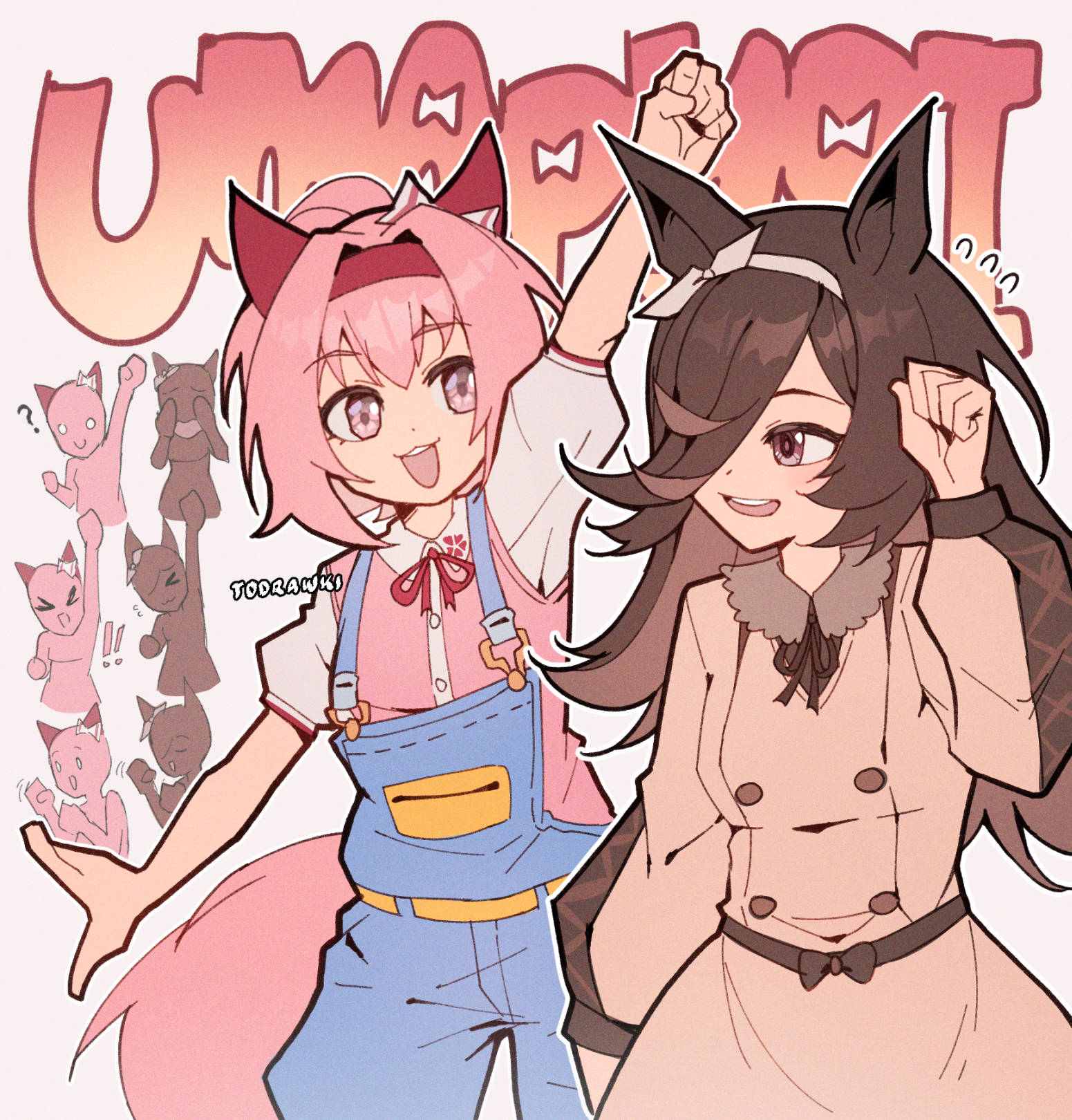 2girls animal_ears artist_name blue_overalls bow breasts brown_eyes brown_hair brown_jacket buttons double-breasted ear_bow flower-shaped_pupils flower_in_eye haru_urara_(casual)_(umamusume) haru_urara_(umamusume) highres horse_ears horse_girl horse_tail jacket long_hair medium_breasts multiple_girls one_eye_covered open_mouth outline overall_shorts overalls pink_hair pink_shirt rice_shower_(umamusume) shirt symbol-shaped_pupils symbol_in_eye tail umamusume umapyoi_(phrase) white_background white_outline white_shirt wokiiarts
