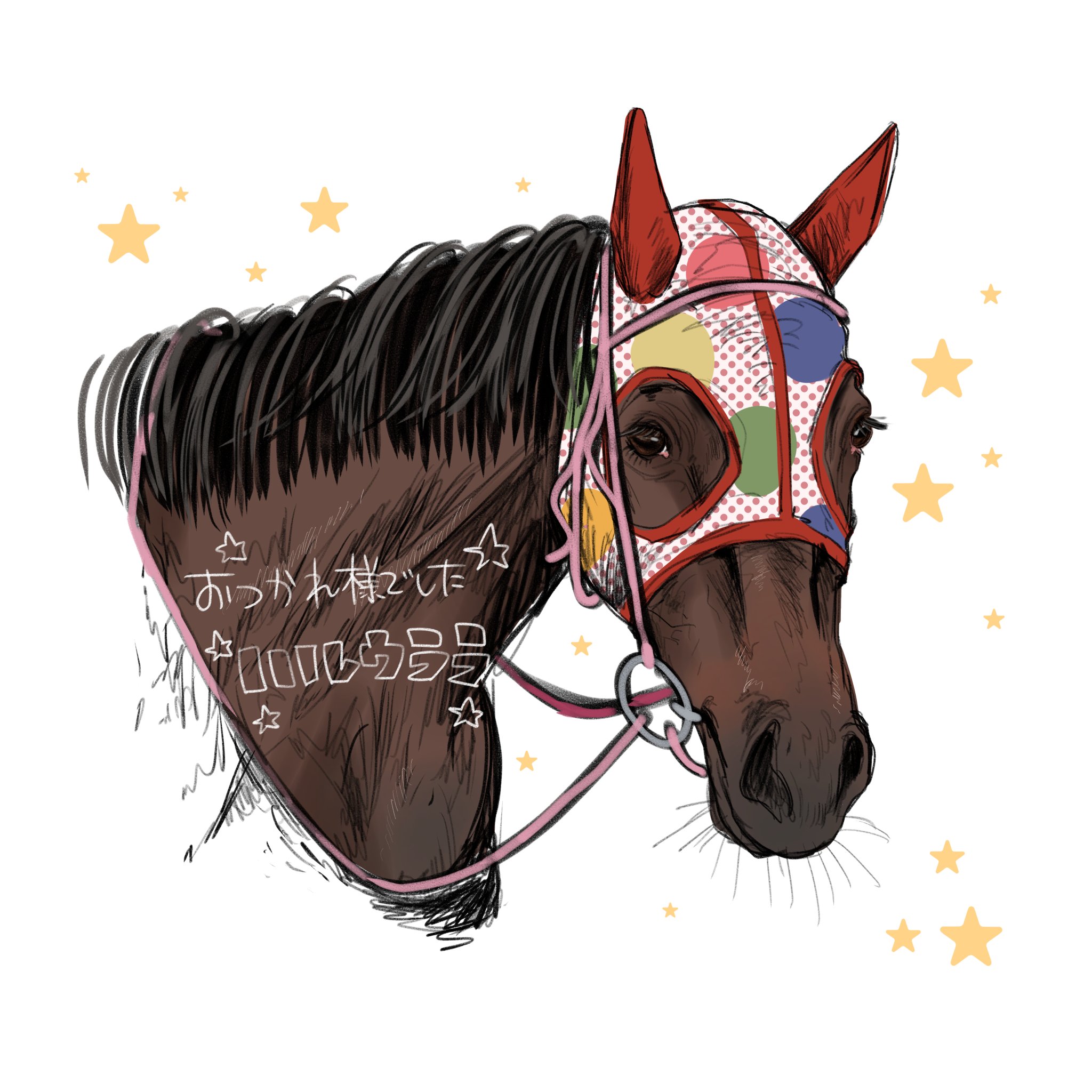 akiyama1107 animal_focus brown_horse haru_urara_(racehorse) highres horse looking_at_viewer mane mask no_humans real_life reins simple_background star_(symbol) white_background