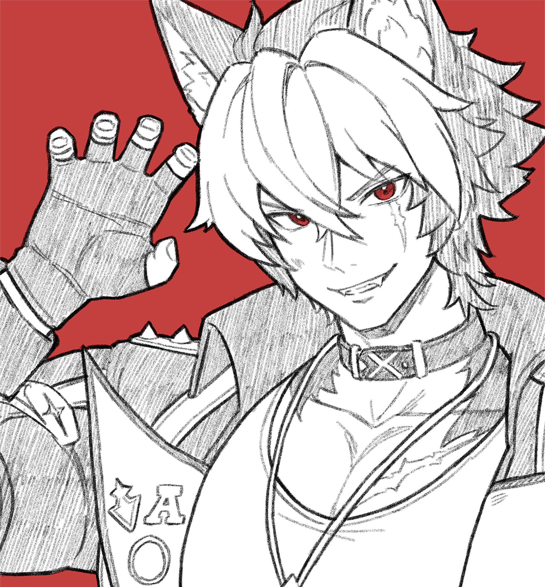 1boy animal_ear_fluff animal_ears arm_up belt_collar claw_pose collar collarbone collared_jacket commentary crossed_bangs dwun_pubg fingerless_gloves fingernails gloves greyscale_with_colored_background grin highres jacket jewelry komano_manato male_focus necklace open_clothes open_jacket pectoral_cleavage pectorals red_background red_eyes scar scar_across_eye scar_on_face short_hair simple_background smile solo spiked_jacket spikes spot_color tank_top teeth upper_body wing_collar zenless_zone_zero
