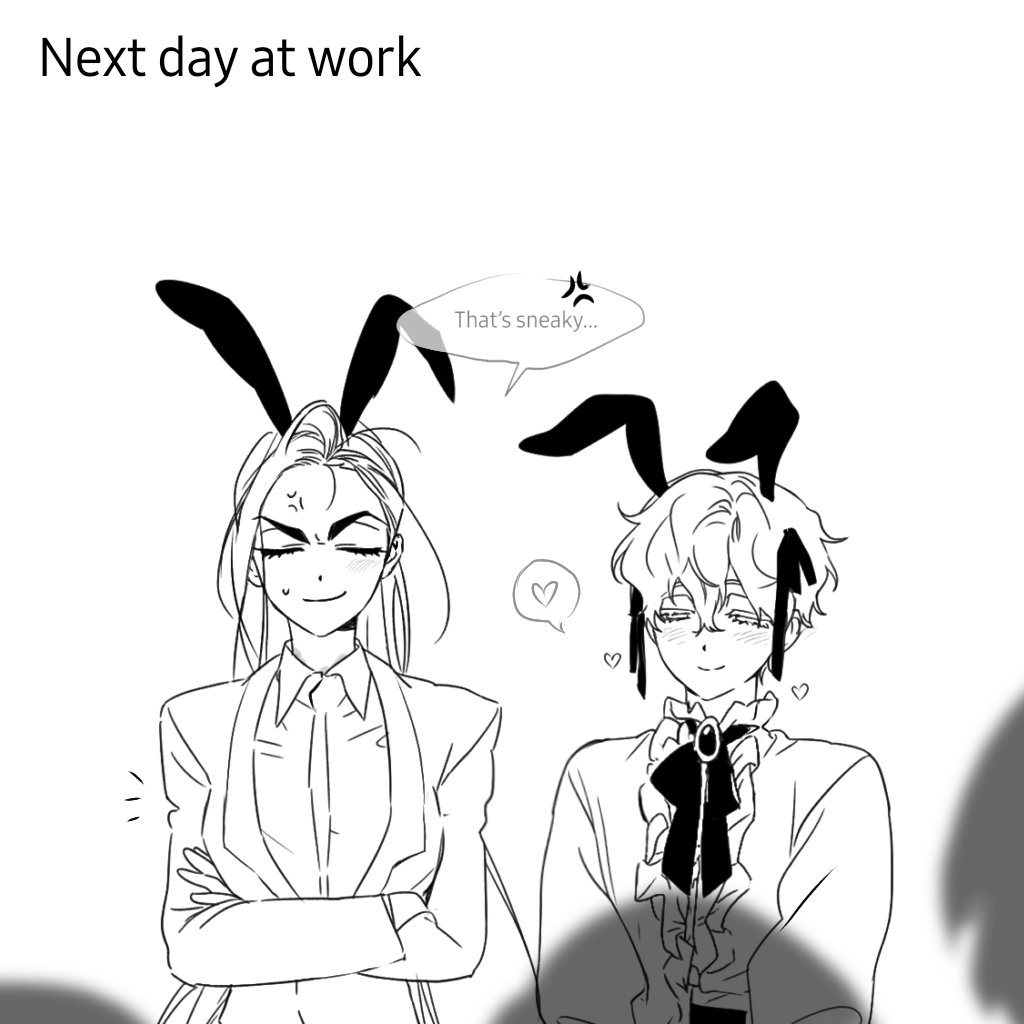1boy 1girl alien_stage anger_vein animal_ears bow bowtie center_frills closed_eyes collared_shirt commentary crossed_arms english_commentary english_text frills greyscale hyuna_(alien_stage) jacket lineart long_hair lubya luka_(alien_stage) monochrome official_alternate_costume rabbit_ears shirt short_hair suit_jacket