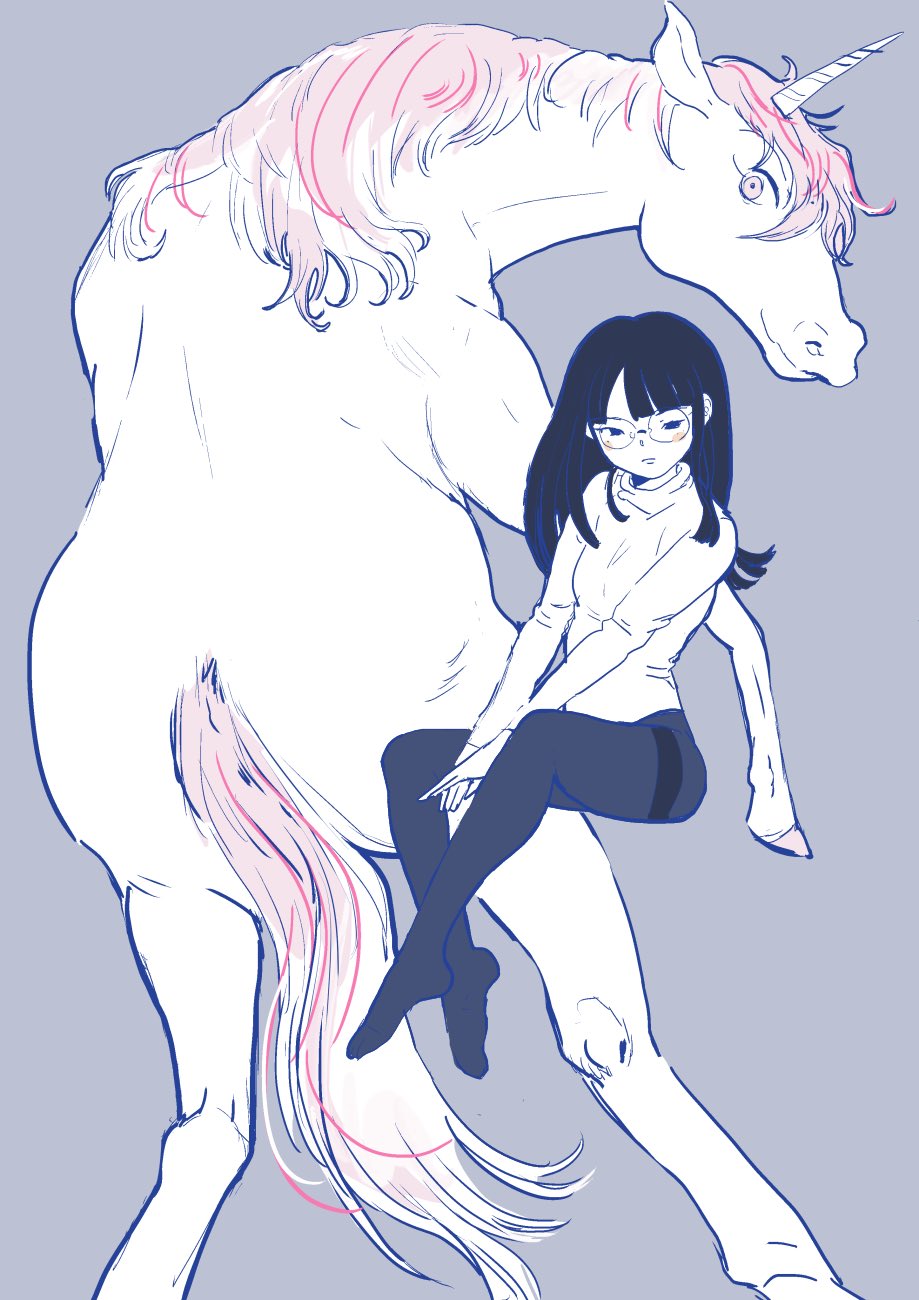 1girl black_hair blunt_bangs emuko_(ikkakujuu_wa_tsuranukanai) full_body glasses highres hooves ikkakujuu_wa_tsuranukanai long_hair pink_hair round_eyewear simple_background ukyu_(komarukoune) uni_(ikkakujuu_wa_tsuranukanai) unicorn unicorn_horn