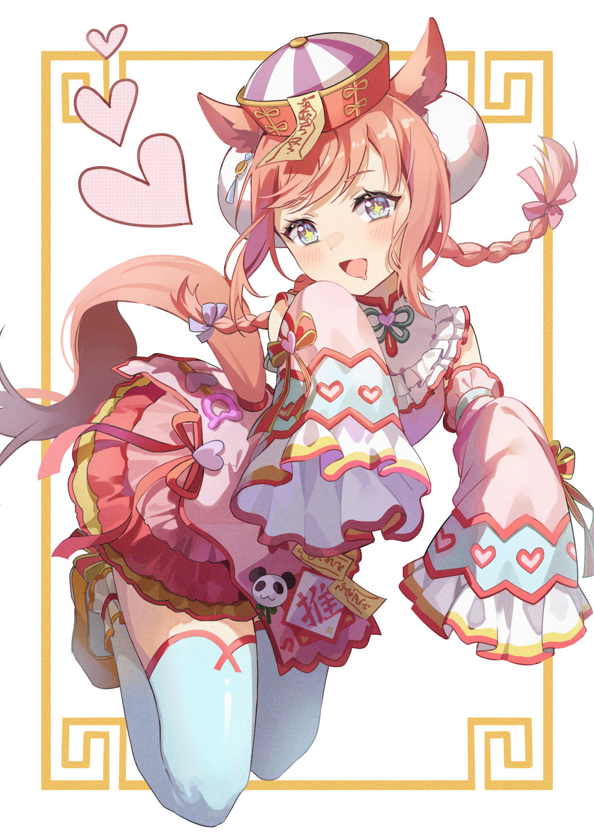 +_+ 1girl :d agnes_digital_(lovely_jiangshi)_(umamusume) agnes_digital_(umamusume) animal_ears blue_eyes blue_thighhighs braid commentary_request detached_sleeves double_bun drooling full_body hair_bun hat highres horse_ears horse_girl hoshiko_(419401x) long_hair long_sleeves looking_at_viewer mouth_drool official_alternate_costume ofuda open_mouth orange_hair panda_ornament qingdai_guanmao simple_background sleeves_past_fingers sleeves_past_wrists smile solo thighhighs twin_braids umamusume white_background