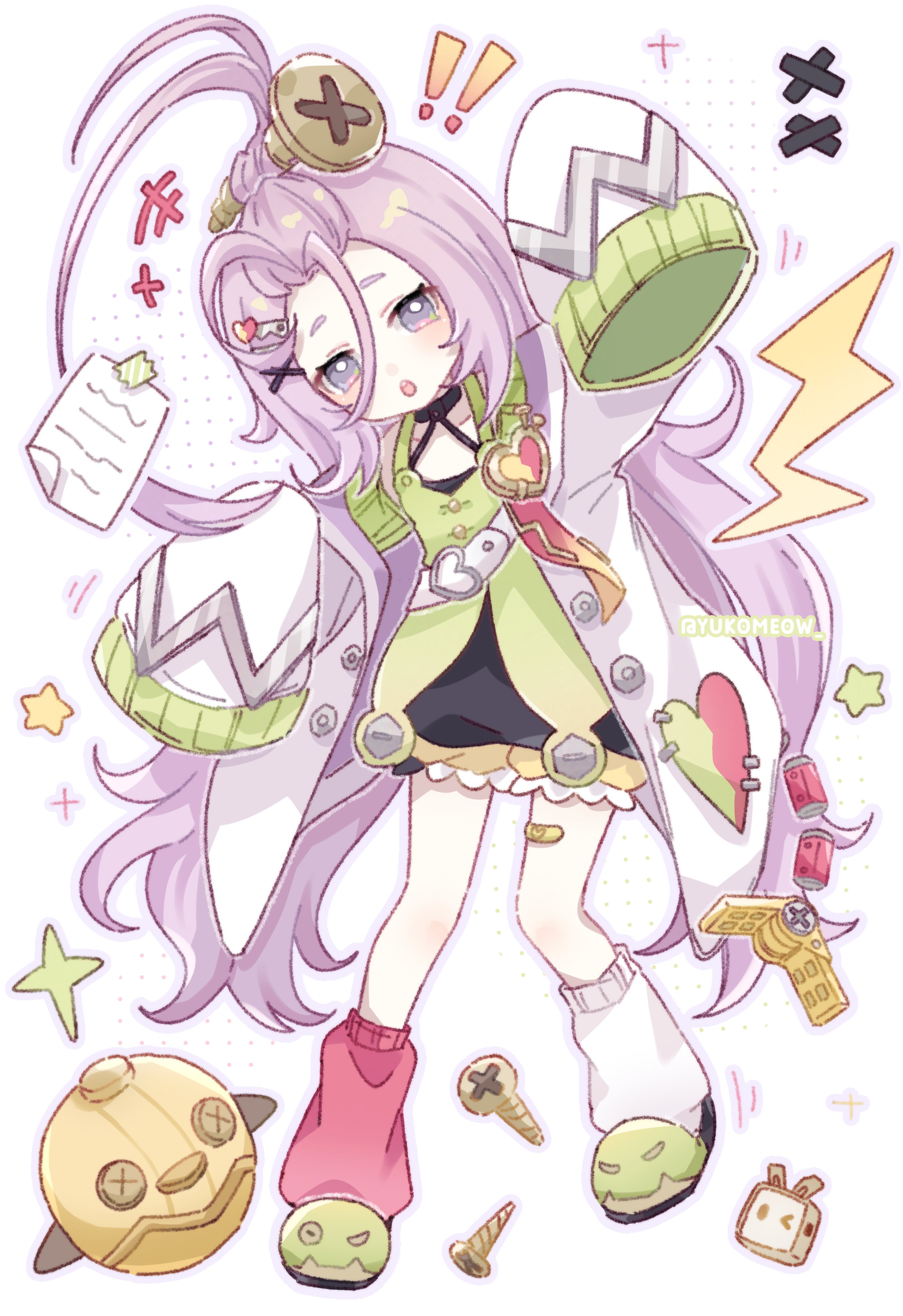 ! !! +++ 1girl :o absurdres ahoge aino_(genshin_impact) arm_up artist_name bandaid bandaid_on_leg bangs_pinned_back belt black_choker black_dress bloomers blush choker coat dress forehead genshin_impact green_dress green_slippers grey_eyes hair_ornament hairclip halter_dress halterneck hashtag-only_commentary heart highres lab_coat long_hair looking_at_viewer mismatched_socks open_clothes open_coat open_mouth paper pink_hair red_socks screw screw_hair_ornament short_eyebrows sidelocks simple_background sleeves_past_fingers sleeves_past_wrists slippers socks solo sparkle star_(symbol) twitter_username underwear very_long_hair white_background white_belt white_coat white_socks x_hair_ornament yukomeow