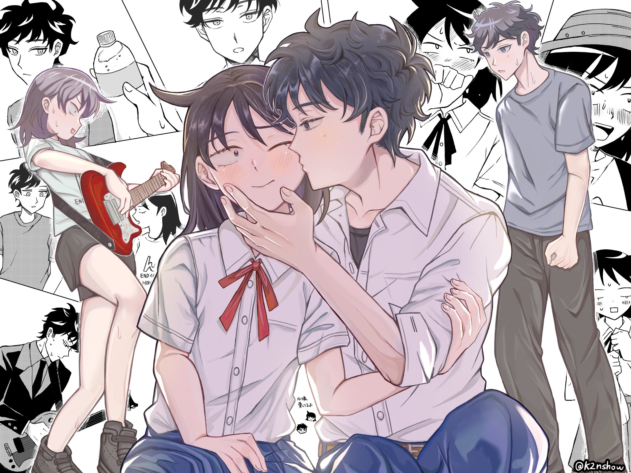 1boy 1girl bien_(k2nshow) black_hair black_pants black_shoes blush bottle breast_pocket bucket_hat collared_shirt commentary_request couple dress_shirt electric_guitar futsuu_no_keion-bu grey_shirt guitar guitar_strap hand_on_another's_arm hand_on_another's_face hat hatono_chihiro hetero highres holding holding_bottle instrument kiss kissing_cheek mizuo_haruichi multiple_views music neck_ribbon one_eye_closed pants partially_colored playing_guitar playing_instrument pocket red_ribbon ribbon school_uniform shirt shoes short_shorts short_sleeves shorts side_ahoge sitting sneakers t-shirt twitter_username undershirt white_shirt