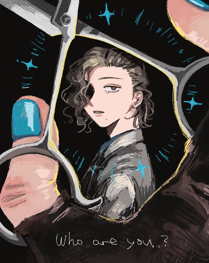 1boy asymmetrical_hair black_background black_gloves blue_nails bright_pupils brown_eyes brown_hair commentary curly_hair dripping_eye english_text fingerless_gloves from_side gloves grey_jacket hagaitaine9 hair_behind_ear hair_over_one_eye holding holding_scissors hypnosis_mic hypnosis_mic:_rule_the_stage jacket looking_at_viewer male_focus mole mole_under_mouth parted_lips pov pov_hands scissors short_hair simple_background solo_focus sparkle untranslatable_commentary takarai_hiyori upper_body white_pupils