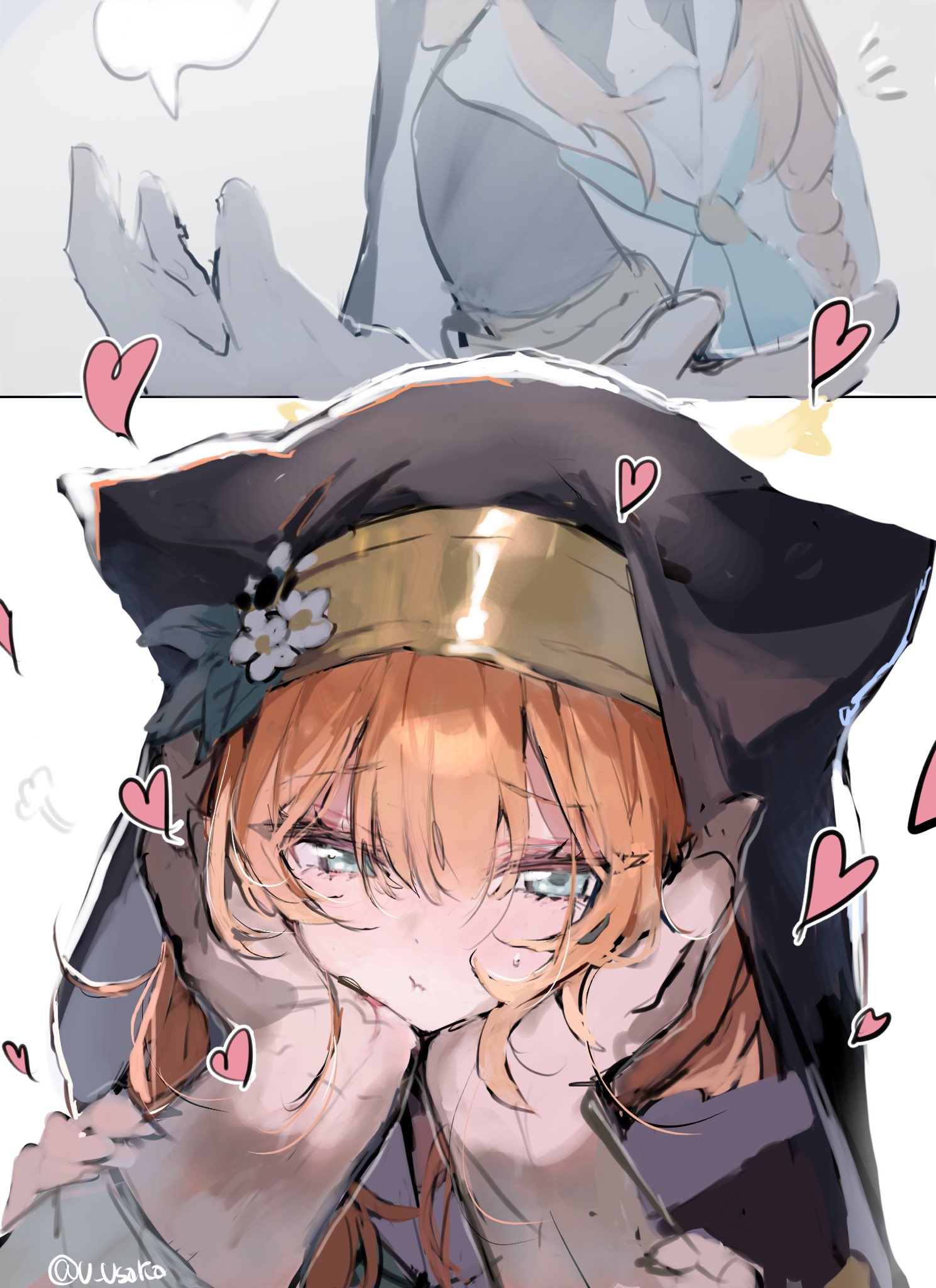1boy 1girl animal_ear_headwear animal_ears black_veil blue_archive blue_eyes blush closed_mouth coif commentary fake_animal_ears flower hair_between_eyes hair_flower hair_ornament halo hands_on_another's_face hat hat_flower heart highres holding_another's_wrist inusaka long_hair looking_at_viewer mari_(blue_archive) notice_lines nun orange_hair sensei_(blue_archive) shy solo_focus twitter_username veil white_flower yellow_halo