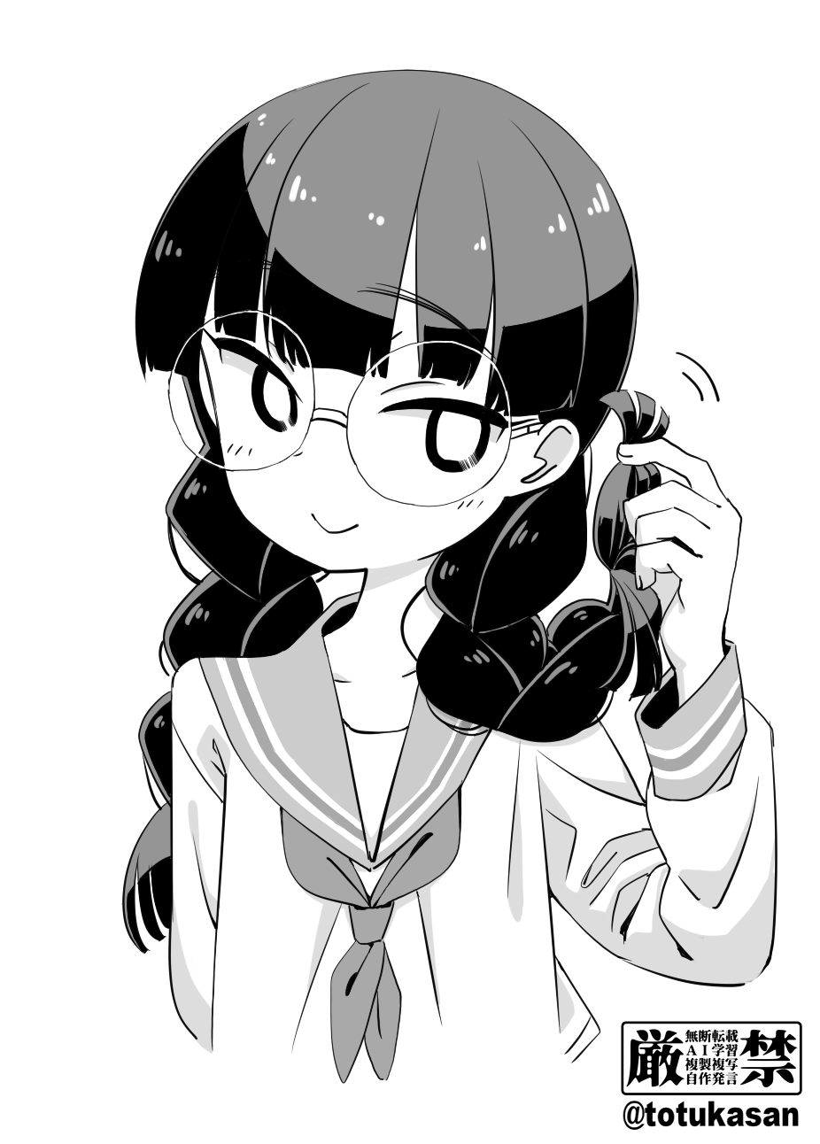 1girl blunt_bangs braid bright_pupils flat_chest glasses greyscale hand_up highres holding holding_own_hair light_blush long_hair long_sleeves looking_at_viewer low_twin_braids monochrome mount_celeb_kaneda-san playing_with_own_hair round_eyewear school_uniform serafuku smile solo totukasan twin_braids twirling_hair upper_body usui_sachiko