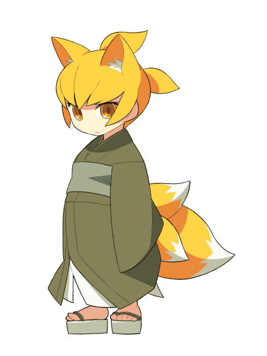 1girl animal_ear_fluff anime_coloring archived_source arm_at_side blonde_hair brown_pupils character_request closed_mouth copyright_request expressionless extra_tails fox_girl full_body green_kimono green_sash green_sleeves grey_sandals itsumo_nokoru japanese_clothes kimono legs_apart looking_at_viewer no_nose obi okobo platform_sandals ponytail sandals sash short_ponytail sidelocks simple_background sleeves_past_fingers sleeves_past_wrists solo standing toes two-tone_tail white_background white_fur white_tail yellow_eyes yellow_fur yellow_tail
