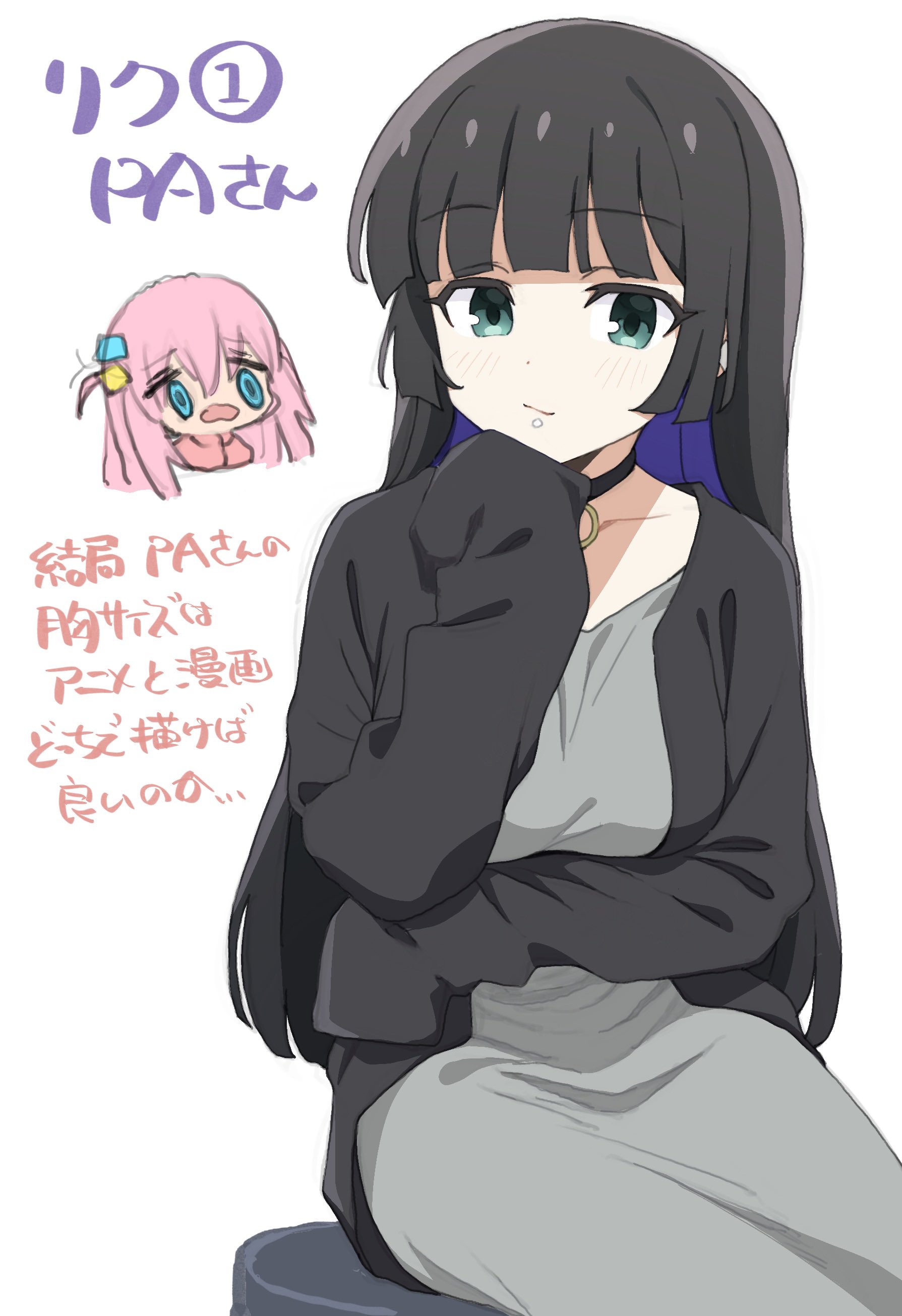 2girls absurdres beads black_choker black_hair black_shirt blue_eyes bocchi_the_rock! breasts choker closed_mouth colored_inner_hair dress drooping face_piercing gotoh_hitori green_hair grey_dress hair_beads hair_ornament highres large_breasts lip_piercing long_sleeves looking_at_viewer multicolored_hair multiple_girls nosir_onadat open_mouth pa-san piercing pink_hair purple_hair shirt simple_background sitting sleeves_past_fingers sleeves_past_wrists solo_focus white_background