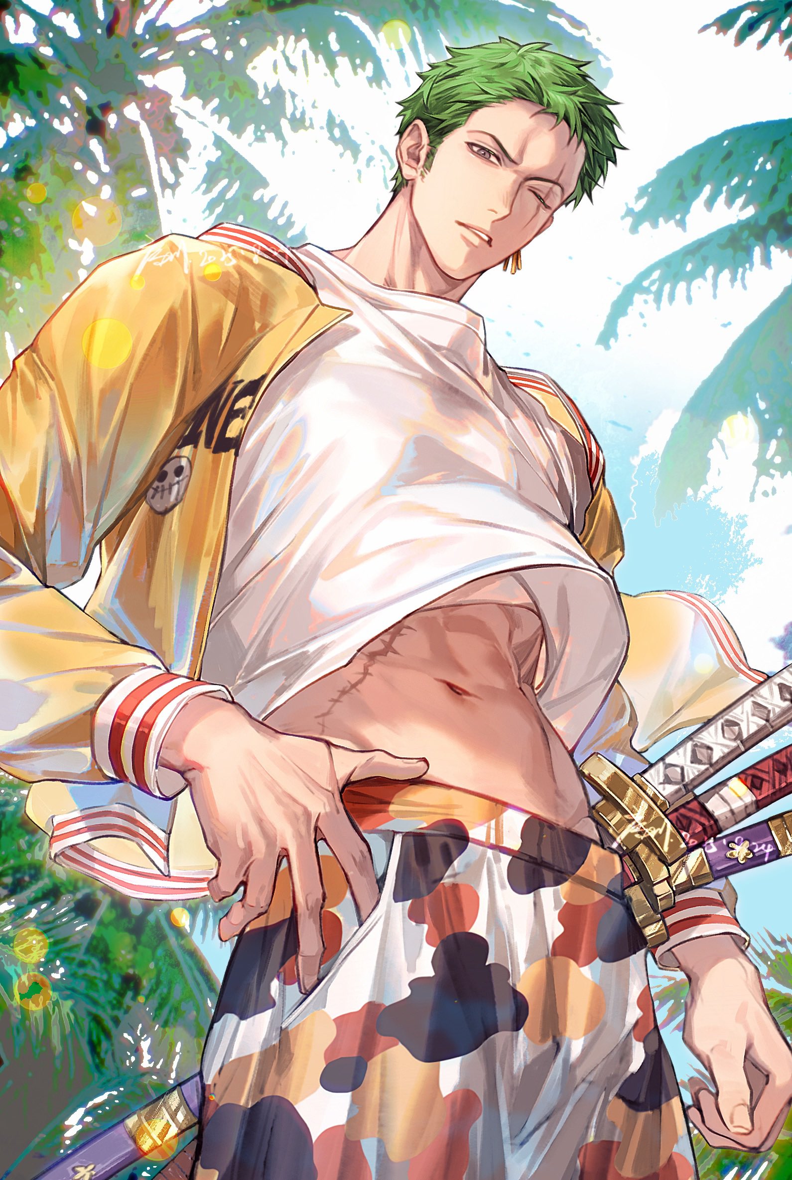1boy abs artist_name commentary cowboy_shot dated day from_below green_hair hand_on_own_hip highres jacket katana looking_at_viewer male_focus midriff navel one_eye_closed one_piece open_clothes open_jacket outdoors palm_tree parted_lips roronoa_zoro scar scar_across_eye scar_on_face sheath sheathed shirt short_hair solo stitched_torso stitches sword tree weapon white_shirt xuchuan yellow_jacket