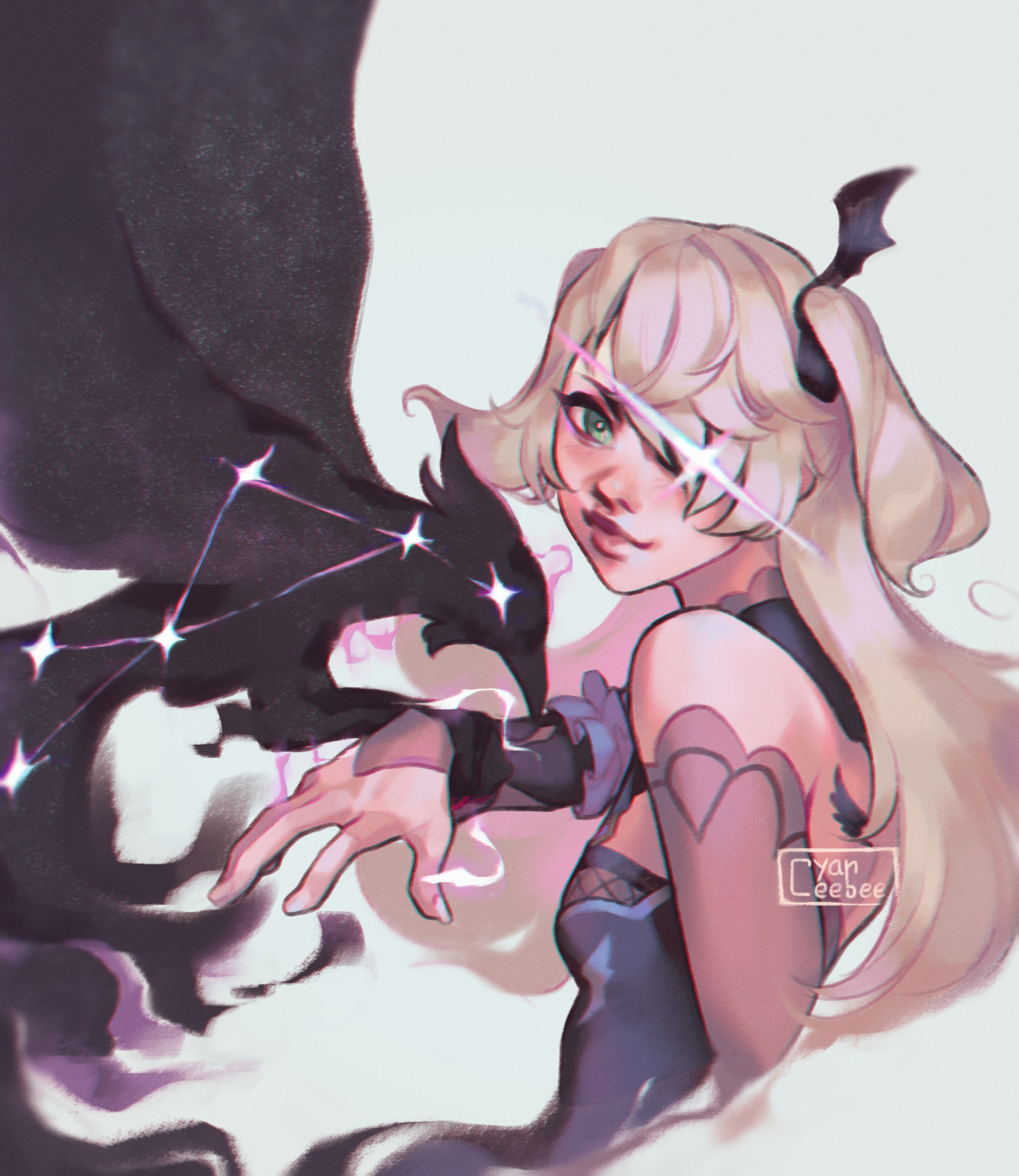 1girl artist_name bat_hair_ornament bird bird_on_hand black_dress blonde_hair blue_background chromatic_aberration closed_mouth crossed_bangs cyber_(cyanceebee) dress electricity electrokinesis fischl_(genshin_impact) from_side genshin_impact green_eyes hair_ornament hair_over_one_eye hand_up highres long_hair looking_at_viewer looking_to_the_side magic oz_(genshin_impact) pink_lips simple_background smile solo sparkle upper_body