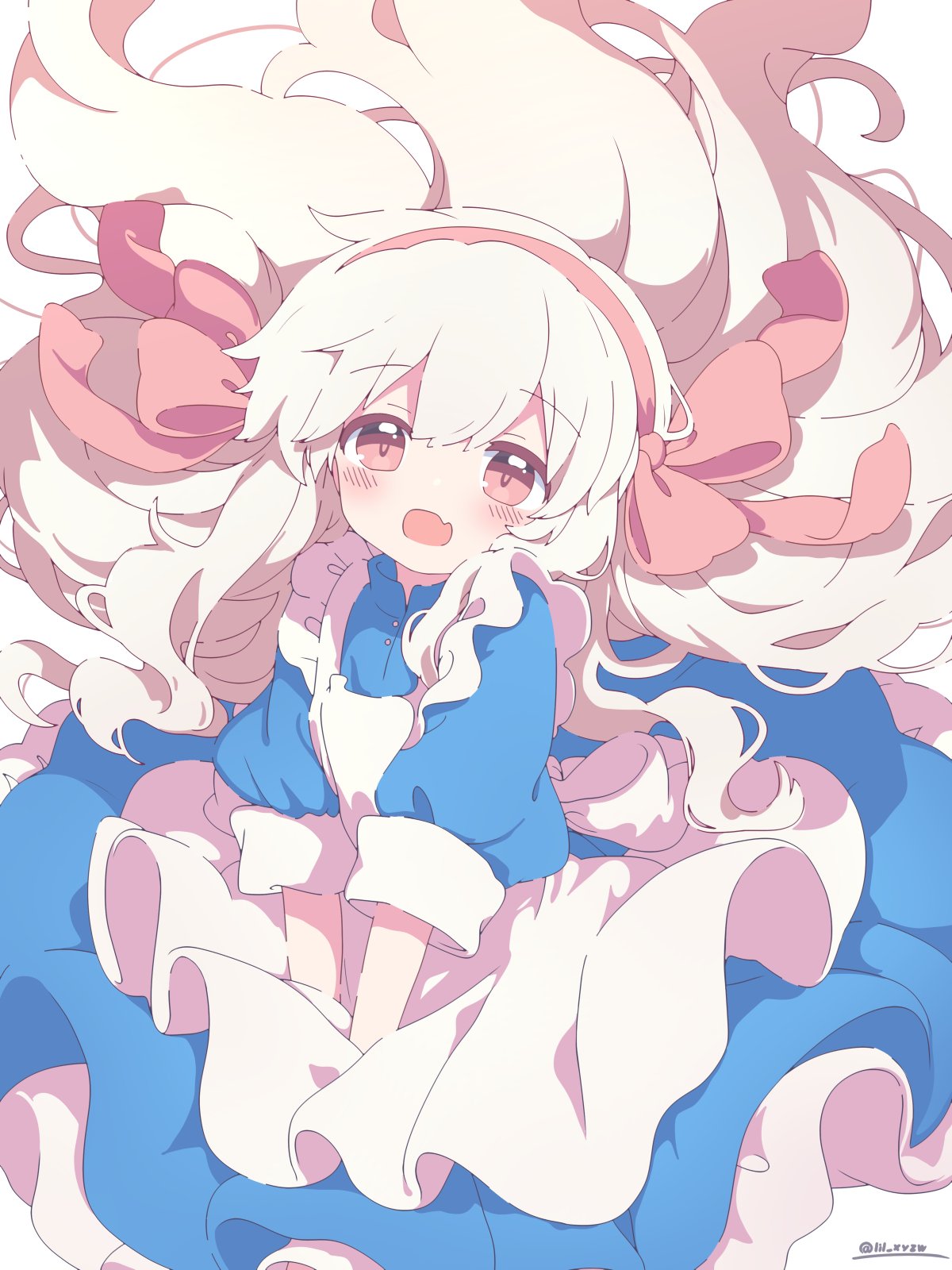 1girl apron blue_dress blush bow bow_hairband collared_dress double-parted_bangs dress fang frilled_apron frills hair_bow hairband highres kozakura_marry lil_(lil_xyzw) long_hair looking_at_viewer open_mouth original pink_bow pink_eyes pink_hairband short_sleeves simple_background smile solo very_long_hair white_apron white_background white_hair
