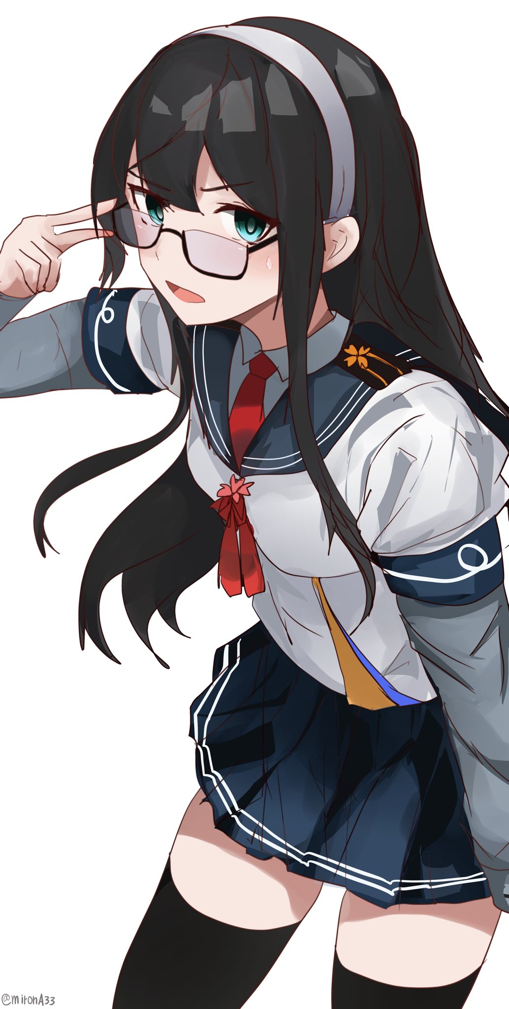 1girl black_hair black_thighhighs blue_eyes blue_sailor_collar blue_skirt commentary_request hairband highres kantai_collection layered_sleeves long_hair long_sleeves looking_at_viewer miron_(mirona33) necktie ooyodo_(kancolle) pleated_skirt pointing pointing_at_self red_necktie sailor_collar sailor_shirt school_uniform semi-rimless_eyewear serafuku shirt short_over_long_sleeves short_sleeves simple_background skirt solo thighhighs under-rim_eyewear white_background white_hairband white_shirt