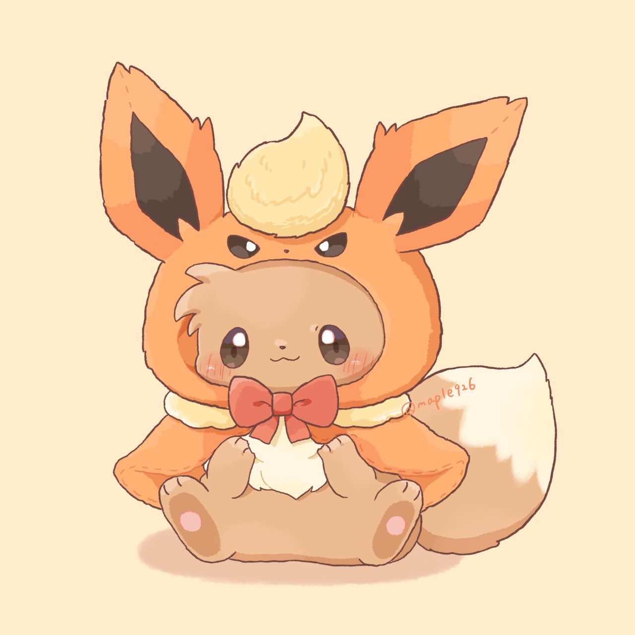 :3 animal_focus blush bow brown_eyes brown_fur closed_mouth cosplay eevee flareon flareon_(cosplay) full_body gen_1_pokemon highres hood hood_up kana_(maple926) looking_at_viewer nintendo no_humans pokemon pokemon_(creature) pokemon_focus simple_background smile solo tail