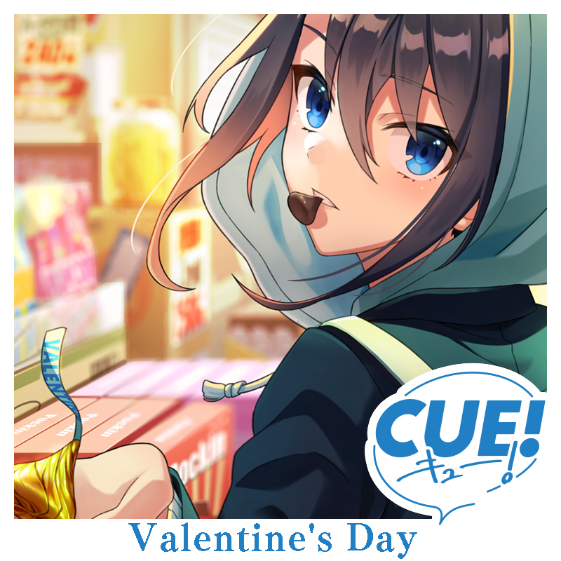 1girl bag black_hair blue_eyes blush box box_of_chocolates chocolate copyright_logo cue! eating english_text food from_behind green_hood green_jacket hood hood_up jacket logo long_sideburns long_sleeves looking_at_viewer official_art shelf shirako_miso shop shoulder_bag sideburns sidelocks solo takatori_maika tsurime upper_body valentine white_bag