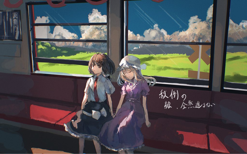 2girls black_skirt blonde_hair blue_sky bow brown_eyes brown_hair closed_eyes closed_mouth cloud collared_shirt commentary_request day dress field hair_bow hat long_dress long_hair maribel_hearn medium_hair mob_cap multiple_girls necktie puffy_short_sleeves puffy_sleeves purple_dress red_necktie shimekake shirt short_sleeves sitting skirt sky touhou train_interior unworn_hat unworn_headwear usami_renko white_bow white_hat white_shirt window