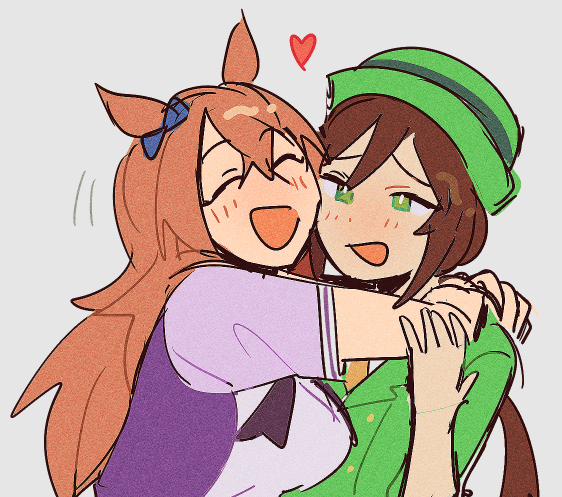 2girls :d ^_^ animal_ears arms_around_neck blue_bow bow brown_hair closed_eyes commentary ear_bow english_commentary film_grain furrowed_brow green_eyes green_hat green_jacket grey_background hair_between_eyes hat hayakawa_tazuna heart horse_ears horse_girl hug jacket long_hair maruzensky_(umamusume) mel_(koginaki) motion_lines multiple_girls open_mouth ponytail purple_shirt school_uniform shirt short_sleeves simple_background smile summer_uniform tracen_school_uniform umamusume upper_body