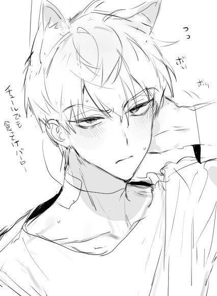 1boy 2a1i7a15pb11392 alien_stage animal_ears cat_boy cat_ears closed_mouth greyscale looking_at_viewer male_focus monochrome portrait scratching_head shirt short_hair sketch solo till_(alien_stage) translation_request very_short_hair
