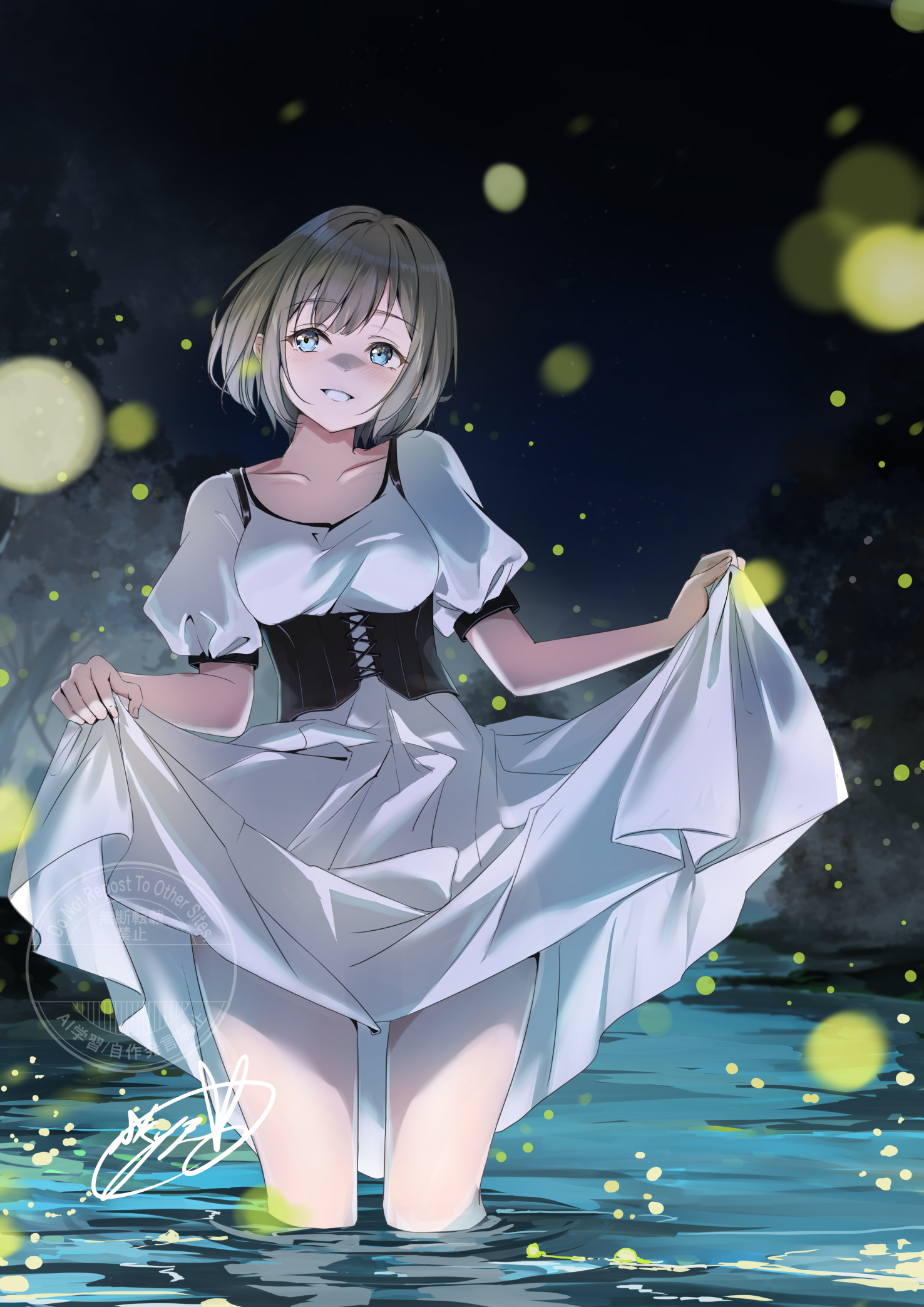 1girl black_corset blonde_hair blue_eyes clothes_lift collarbone commentary_request corset cross-laced_clothes cross-laced_corset dress fireflies highres night original puffy_short_sleeves puffy_sleeves short_hair short_sleeves signature skirt skirt_lift solo soragane_(banisinngurei) wading water white_dress