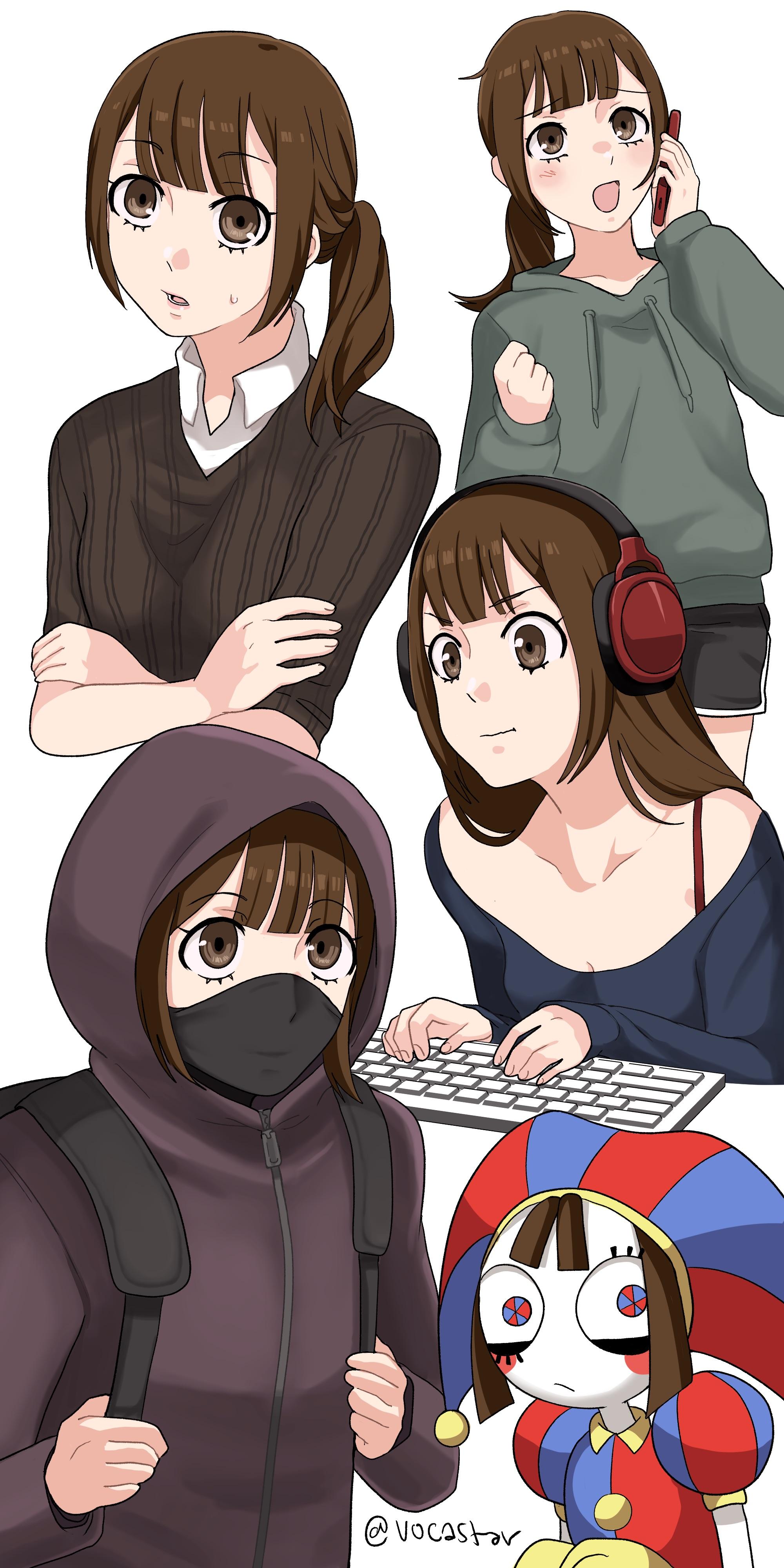 absurdres bare_shoulders blue_eyes brown_eyes brown_hair cellphone closed_mouth crispinfairlie crossed_arms glitch_productions hat headphones highres holding holding_phone hood hoodie humanization jester_cap jester_costume mask mouth_mask multicolored_eyes multicolored_hat phone pomni_(the_amazing_digital_circus) ponytail purple_hoodie red_eyes simple_background smartphone striped_clothes striped_headwear the_amazing_digital_circus two-tone_eyes vertical-striped_bodysuit vertical-striped_clothes vertical-striped_headwear white_background