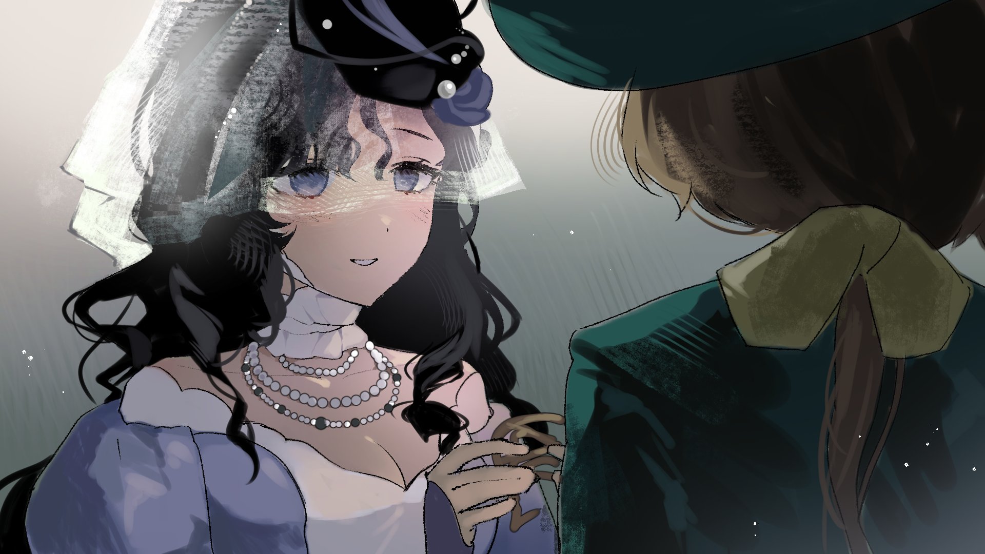 2girls bare_shoulders black_hair black_hat breasts brown_hair cleavage dress face-to-face facing_another facing_away green_hat green_jacket grey_background grin guni_(9guniguni) hands_up hat highres holding isolde_(reverse:1999) jacket jewelry kakania_(reverse:1999) looking_at_another multiple_girls necklace pearl_necklace purple_dress purple_eyes reverse:1999 see-through_clothes see-through_veil smile upper_body veil