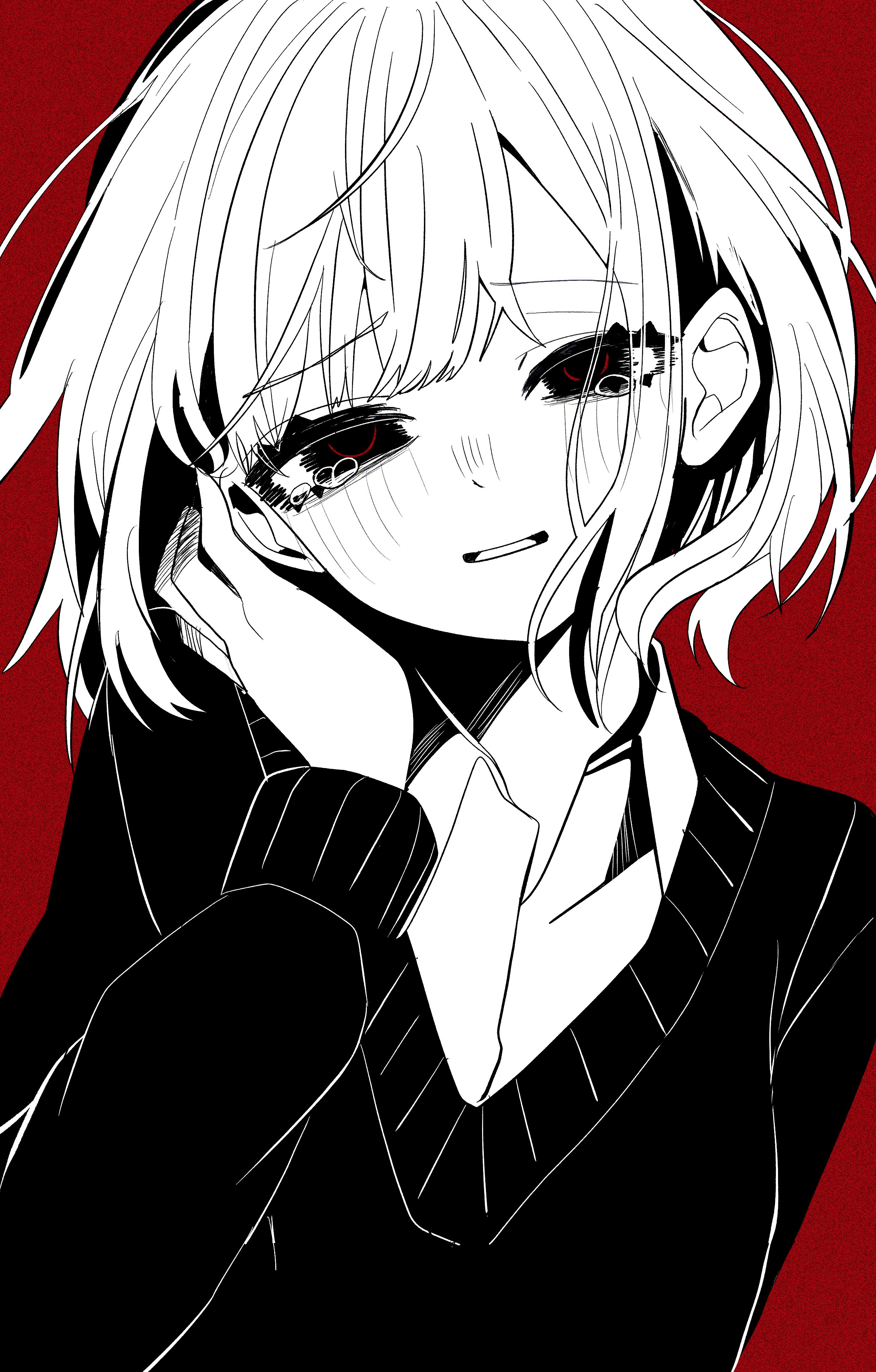 1girl :d absurdres arm_behind_back breasts collared_shirt commentary_request eyes_visible_through_hair greyscale_with_colored_background grin hand_on_own_cheek hand_on_own_face hand_up hatching_(texture) high_contrast highres ibitsu_na_wake_oshiete_ageru_(vocaloid) koze_azhi long_sleeves looking_at_viewer milestone_celebration open_mouth puffy_long_sleeves puffy_sleeves raised_inner_eyebrows red_background school_uniform shirt short_hair simple_background small_breasts smile solo sweater swept_bangs tearing_up upper_body vocaloid