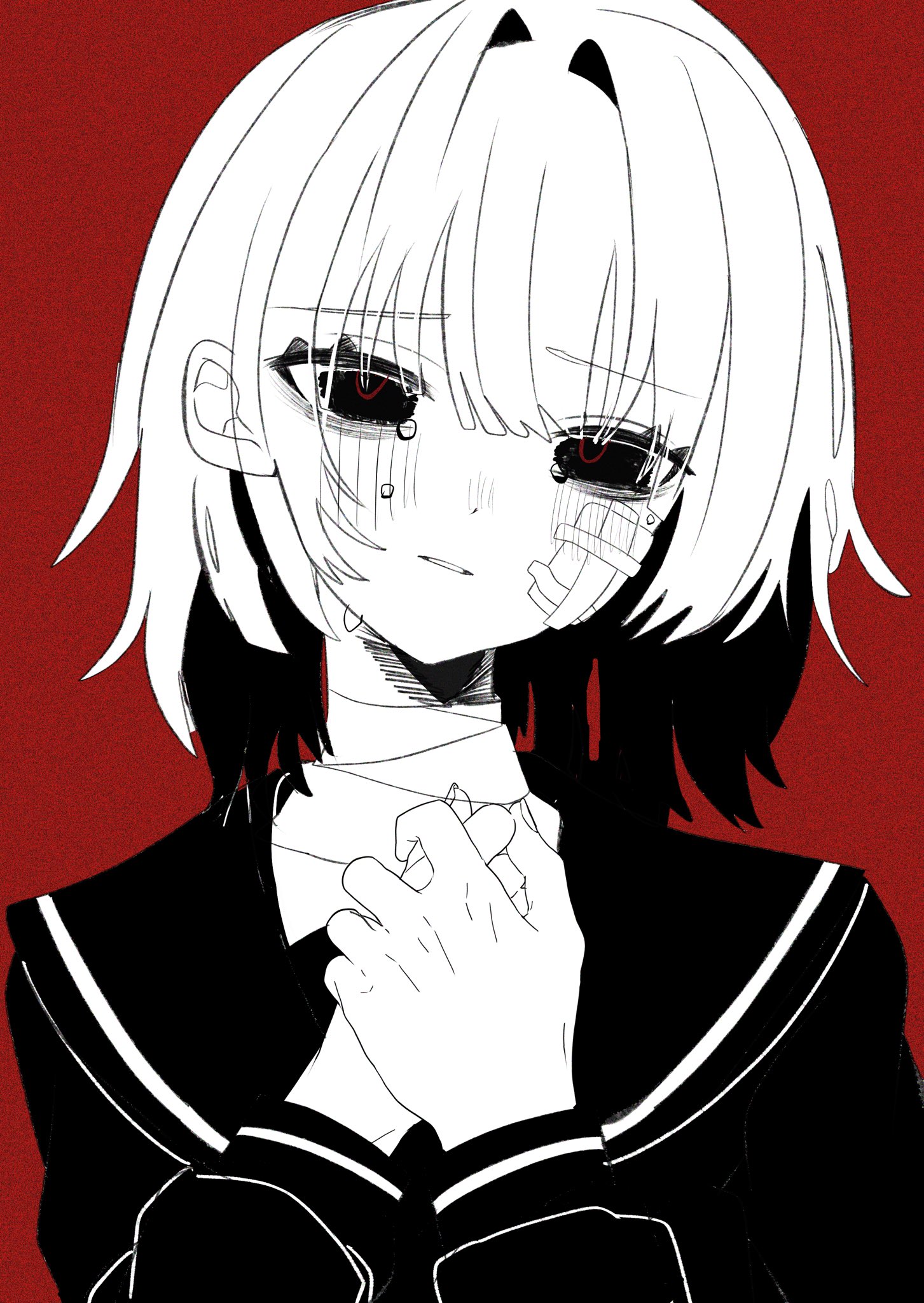 1girl bags_under_eyes bandaged_neck bandages commentary_request cross-eyed crying crying_with_eyes_open film_grain fingernails greyscale_with_colored_background hair_between_eyes hair_intakes hands_up head_tilt high_contrast highres koze_azhi long_sleeves medium_hair original own_hands_together puffy_long_sleeves puffy_sleeves raised_inner_eyebrows red_background sailor_collar school_uniform shirt simple_background solo swept_bangs tears upper_body