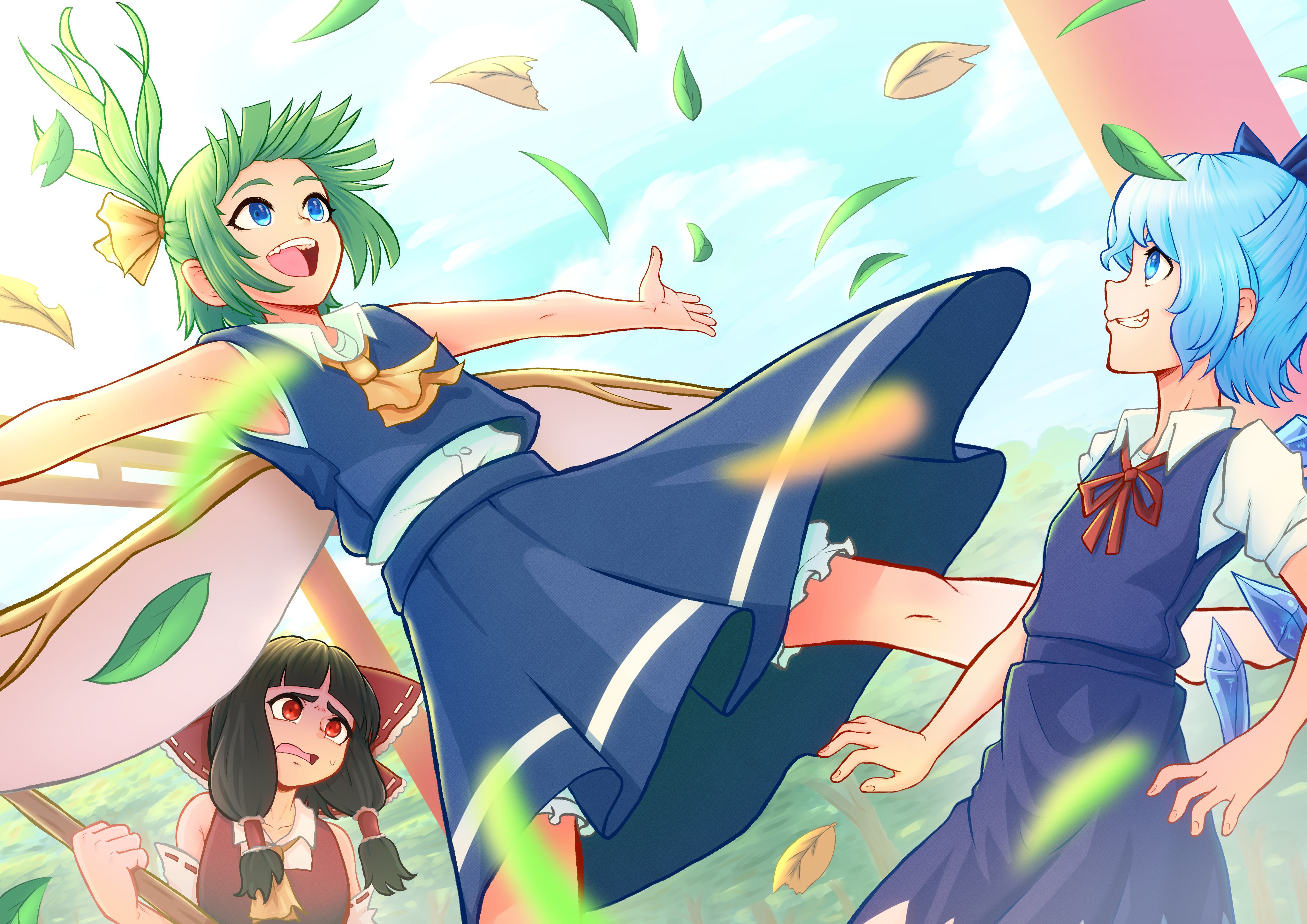 3girls absurdres alternate_hairstyle ascot bloomers blue_bow blue_eyes blue_hair blue_skirt blue_sky blue_vest bow brown_hair cirno cloud collared_shirt commentary daiyousei day detached_sleeves detached_wings english_commentary fairy fairy_wings falling_leaves frilled_bow frilled_hair_tubes frills green_hair grin hair_bow hair_tubes hakurei_reimu highres ice ice_wings leaf long_hair multiple_girls neck_ribbon open_mouth outdoors outstretched_arms red_bow red_eyes red_ribbon revenge_(vengerezn) ribbon ribbon-trimmed_sleeves ribbon_trim shirt skirt sky smile spread_arms sweatdrop touhou underwear vest white_bloomers white_shirt wings yellow_ascot