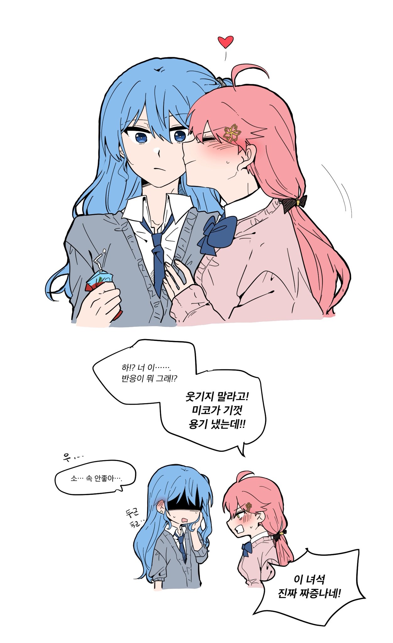 2girls blue_bow blue_bowtie blue_eyes blue_hair blue_necktie blush bow bowtie cardigan closed_mouth collared_shirt ear_blush grey_cardigan h_ero_d heart highres hololive hoshimachi_suisei kiss kissing_cheek korean_text long_hair multiple_girls necktie pink_cardigan pink_hair sakura_miko school_uniform shaded_face shirt simple_background speech_bubble translation_request twintails virtual_youtuber white_background white_shirt yuri