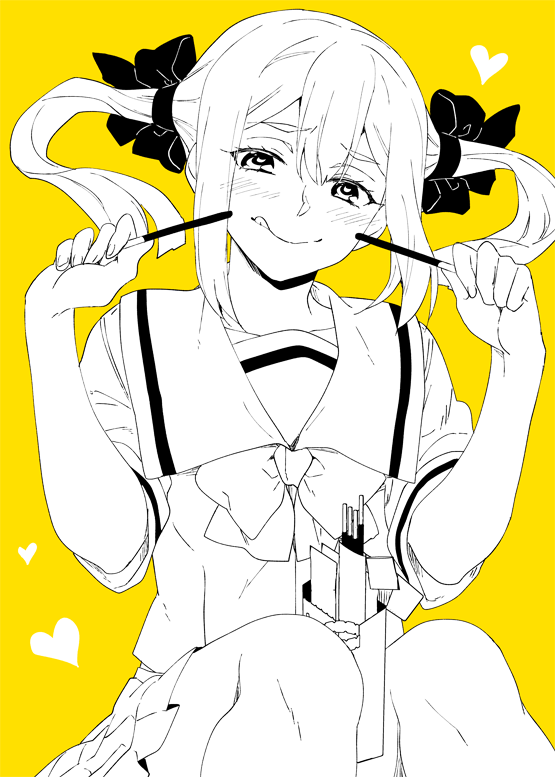 1girl black_ribbon blush bow chuo_tanegashima_high_school_uniform collarbone food hair_between_eyes hair_bow hair_ornament hair_ribbon holding holding_food holding_pocky holding_with_thighs ikuhashi_muiko koujiro_frau long_hair looking_at_viewer monochrome pleated_skirt pocky ribbon robotics;notes sailor_collar school_uniform science_adventure shirt short_sleeves simple_background skirt smile solo tongue tongue_out twintails yellow_background